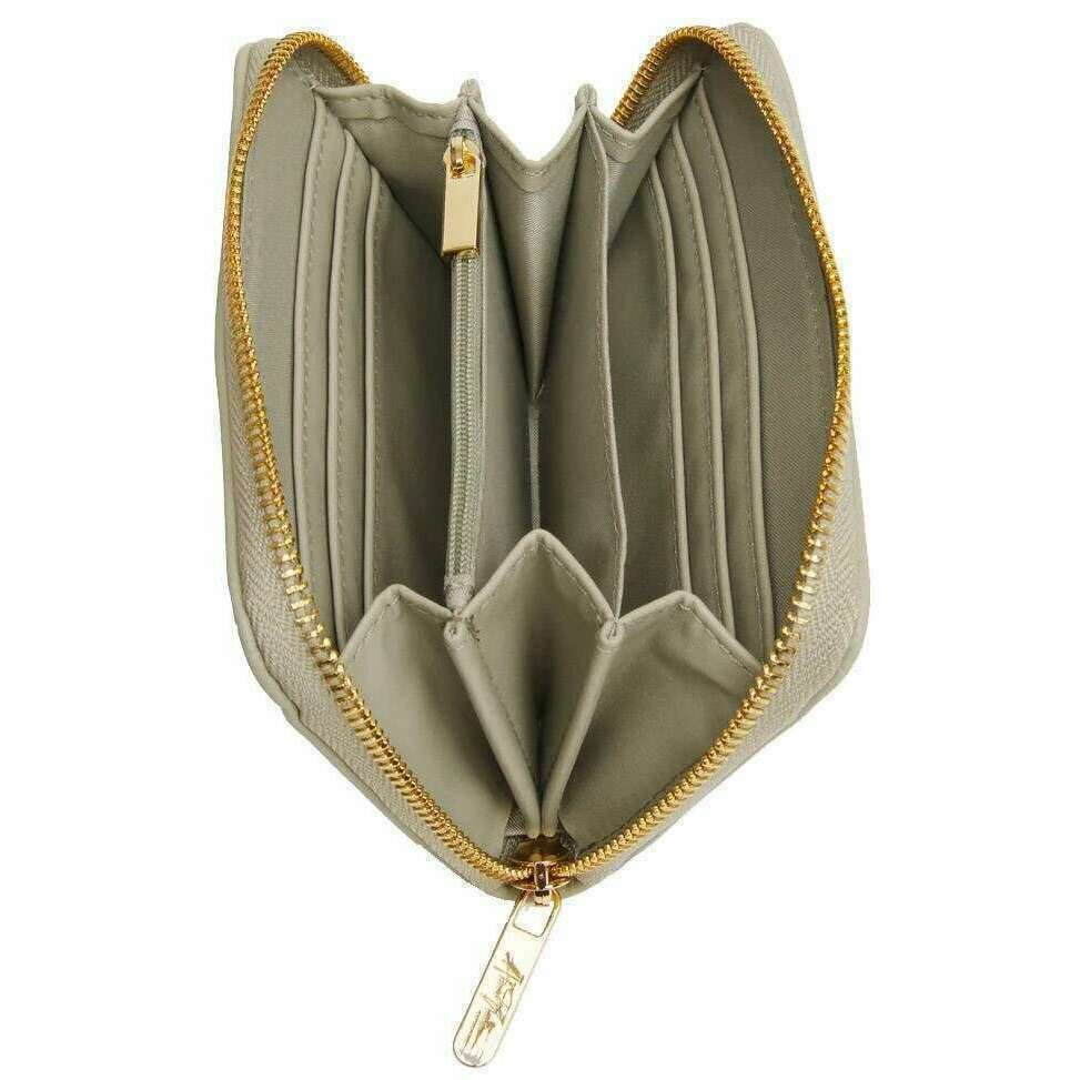 • Reißverschluss, 2 separate Fächer, Reißverschlussmünzenbeutel, hält 6 Karten, goldene Hardware