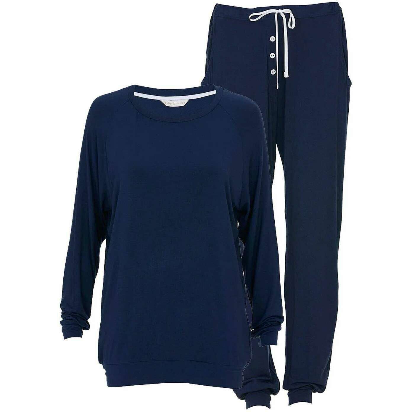 Dieses Marina-Slouch-Jersey-Pyjama-Set für Damen der Marke Cyberjammies besteht aus 95 % Modal und 5 % Elasthan und ist in Marineblau erhältlich. Auch die marineblauen Pyjamas haben ein schlichtes Muster. Es wird empfohlen, sie auf links in der Maschine zu waschen, nicht einzuweichen und mit ähnlichen Farben zu waschen, um diese Pyjamas in gutem Zustand zu halten. Alle Pyjamas werden komplett mit Cyberjammies-Tags geliefert. Das Cyberjammies Marina Slouch Jersey-Pyjama-Set – Navy macht diese bequemen Momente noch gemütlicher. Tragen Sie diese einfach wunderschönen, locker sitzenden, aber nicht zu weiten Pyjamas immer dann, wenn Sie zu Hause chillen, genießen Sie das weiche, dehnbare Material und umarmen Sie sie wie eine zweite Haut. Die Hose verfügt über einen elastischen Bund mit flachen Knöpfen und einen verstellbaren Kordelzug, um absoluten Komfort zu gewährleisten. Die Jersey Slouch-Jammies sind durchdacht für erholsame Nächte und entspannte Morgen konzipiert und werden zu einem festen Bestandteil Ihrer Sammlung.