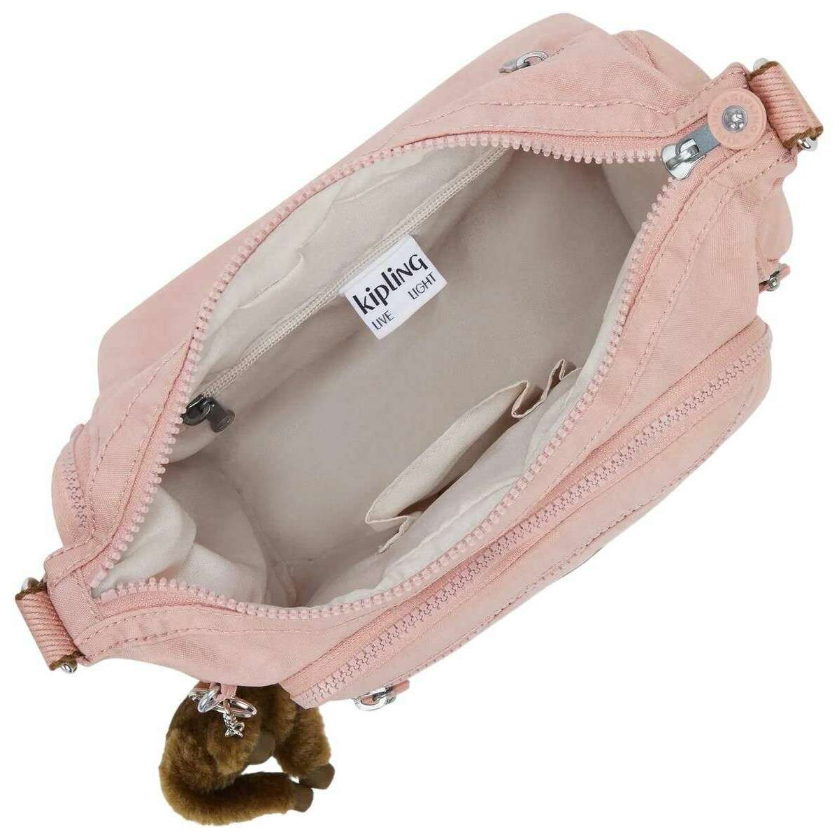 • Hauptfach mit Reißverschluss, Handyfach, Stiftschlaufe, Innentasche mit Reißverschluss, verstellbarer Riemen, Kipling Monkey Schlüsselanhänger