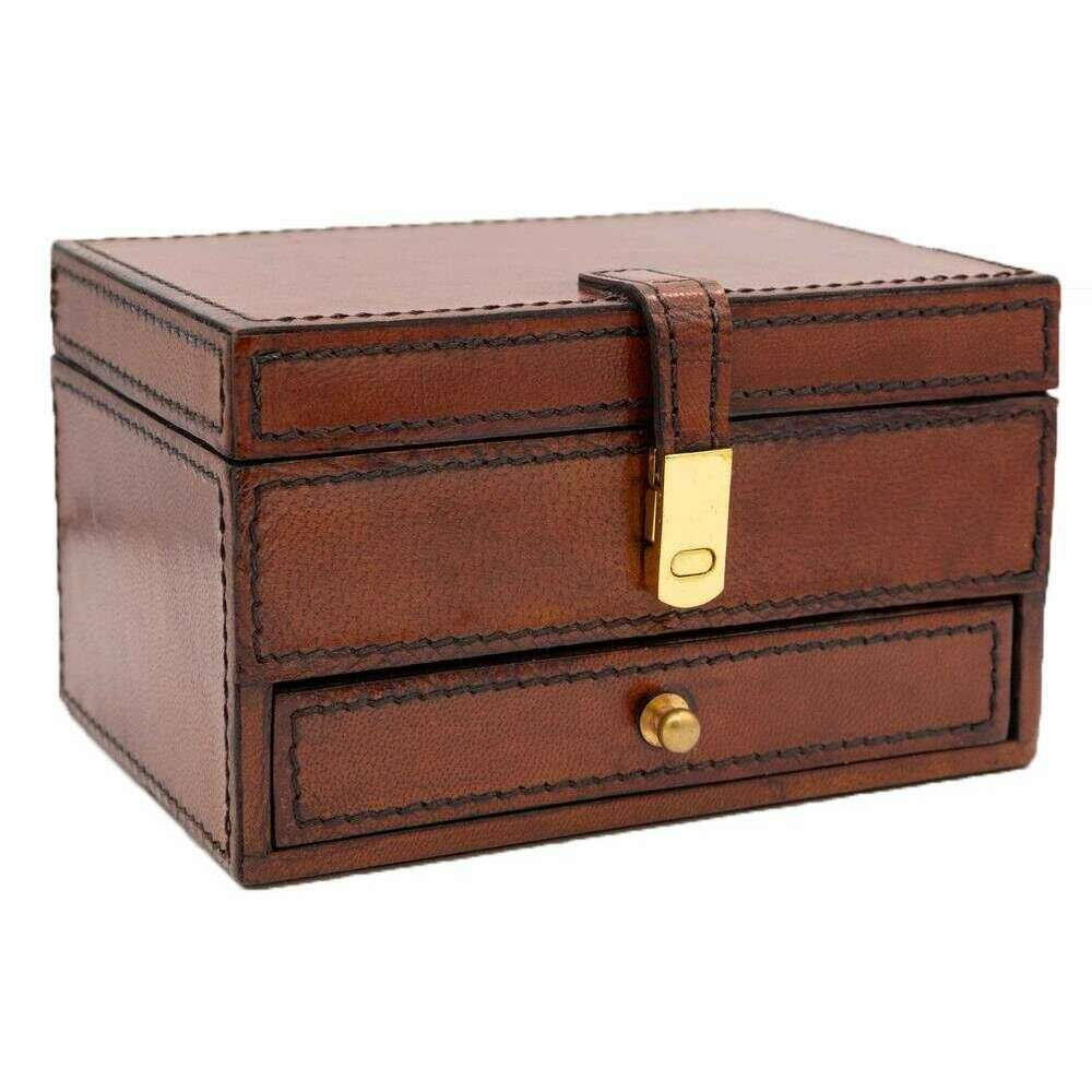 Von der Marke zu Ihnen gebracht Orton West, Diese Schmuckschatulle für braune Damen -Lederschubladen besteht aus 100% Leder. Es misst 9 cm (Höhe) x 15,5 cm (Breite) x 10,5 cm (Tiefe). Alle Schmuckschachteln sind mit Orton Westverpackung ausgestattet. Der Orton West Lederschubladen Schmuckschatulle - Brown verfügt über dunkle Nähte auf dem schönen Ledermaterial, um Tiefe und einen Vintage -Touch zu verleihen. Diese Schachtel kombiniert Praktikabilität mit Eleganz, da die drei Abschnitte für den gesamten atemberaubenden Schmuck aufbewahrt werden, während die zusätzliche Schublade noch mehr Aufbewahrung für die Organisation bietet. Mit Gold Hardware vervollständigt dieses zeitlose Design.