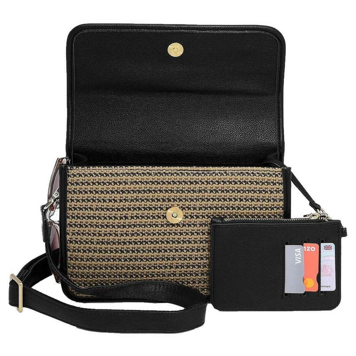 Wir stellen Ihnen diese Bast-Umhängetasche für Damen von vor Stackers, Es besteht aus Bast-Effekt und Kunstleder in der Farbe Schwarz. Es misst 17 cm (Höhe) x 7,5 cm (Breite) x 25 cm (Tiefe). Alle Taschen werden komplett in einer Stapelverpackung geliefert. Die Stackers Raffia-Umhängetasche – Schwarz Bast ist ein Muss für unterwegs! Diese einzigartige und trendige Umhängetasche aus schwarzem Bast verfügt über mehrere Taschen, einen stapelbaren Kosmetikspiegel und ein herausnehmbares Kartenfach. Perfekt für den täglichen Gebrauch mit seinem abnehmbaren und verstellbaren Umhängeriemen.