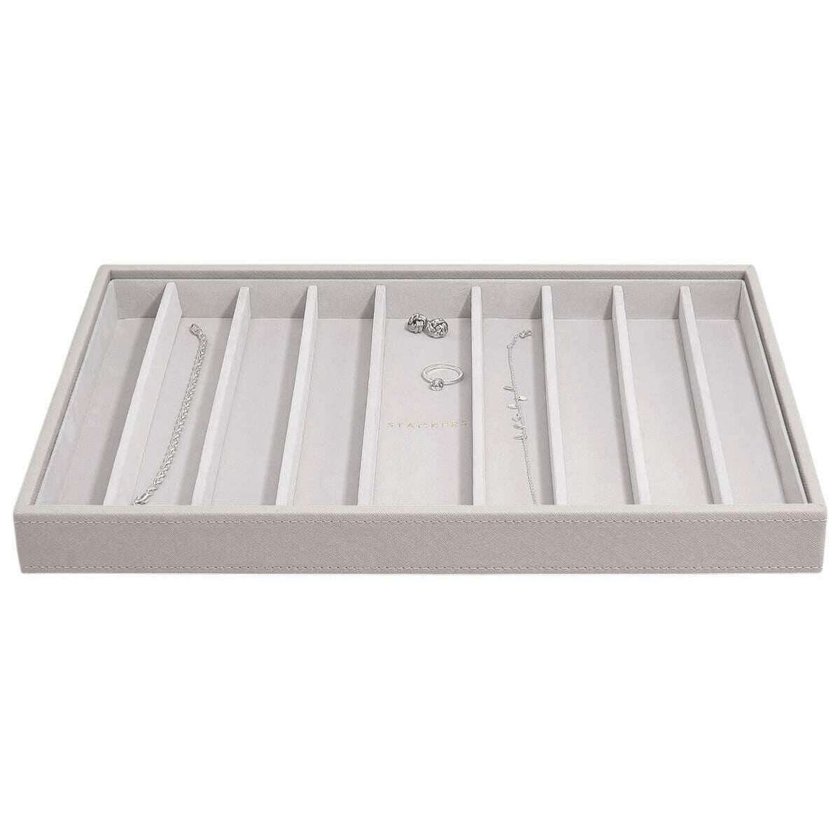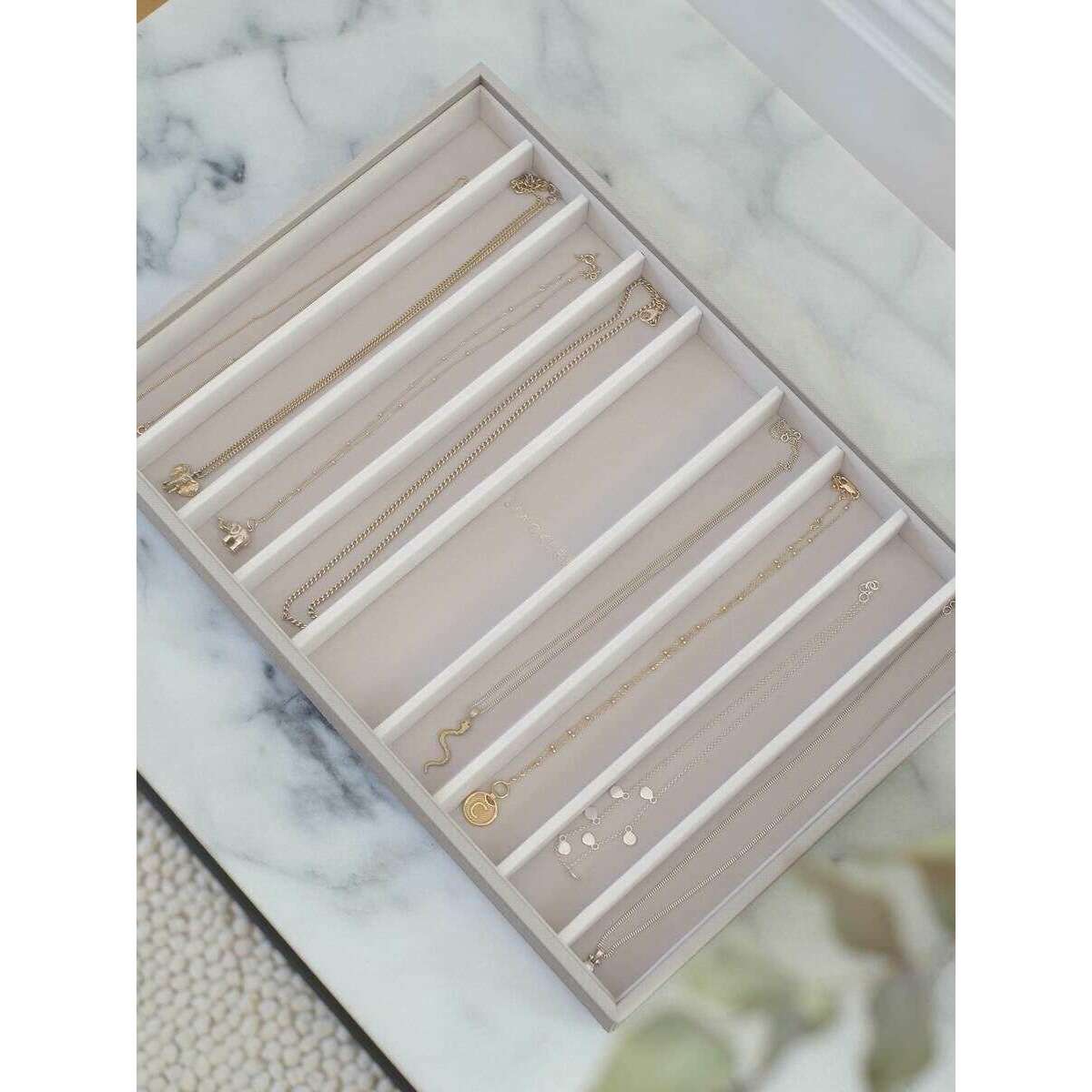 Diese gut gefertigte Damen-Halskette in Übergröße von Stackers ist in der Farbe Taupe-Beige erhältlich und aus Kunstleder und Samt gefertigt. Es misst 4 cm (Höhe) x 36 cm (Breite) x 23,9 cm (Tiefe). Es wird empfohlen, die Schmuckschatulle sauber zu wischen, um sie in gutem Zustand zu halten. Alle Schmuckkästchen werden komplett mit einer Stapelverpackung geliefert. Die Stackers Supersize Necklace Layer – Taupe Beige wurde entwickelt, um Ihre Halsketten organisiert zu halten und zu verhindern, dass sie sich verheddern. Mit einer weichen Samtinnenseite wird dies mit Sicherheit diejenigen beeindrucken, die viel Schmuck organisieren und vor Beschädigungen schützen möchten. Aufgrund seines schlichten Designs eignet es sich perfekt für die Aufbewahrung auf Ihrer Kommode oder Kommode und passt in jeden Raum. Alternativ kann es mit anderen übergroßen Schichten kombiniert werden, um Ihr perfektes Schmuckkästchen zu schaffen.