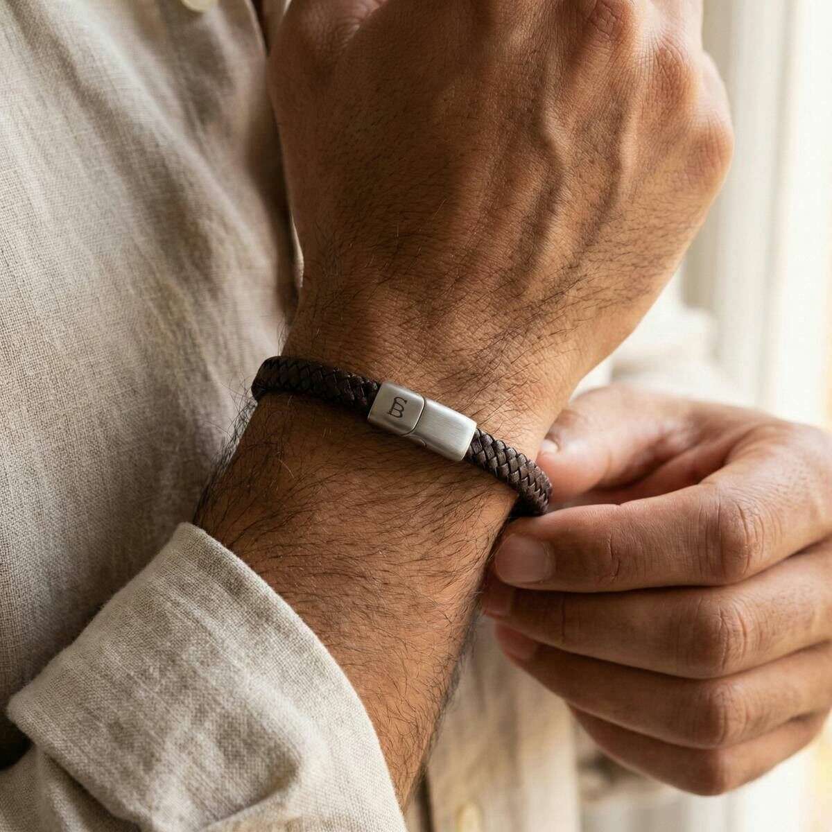 Designer Steel & Barnett hat Ihnen dieses Herrenarmband aus 100 % Rindsleder und Edelstahl in Vintage-Brauntönen präsentiert. Alle Armbänder werden komplett in einer Stahl- und Barnett-Verpackung geliefert. Das Steel & Barnett Riley Sleek Braided Leather Armband – Vintage Brown ist so gefertigt, dass es sowohl Stärke als auch Zuverlässigkeit verkörpert und ein raffiniertes Accessoire bietet, das für jede Sammlung geeignet ist. Das 6 mm schlanke Profil besteht zu 100 % aus echtem Rindsleder und verfügt über ein elegant geflochtenes Design, das subtile Raffinesse bietet, ohne Einbußen bei der Haltbarkeit hinnehmen zu müssen. A Die aus 316L-Edelstahl gefertigte Schließe aus gebürstetem Stahl bietet außergewöhnliche Widerstandsfähigkeit gegen Abnutzung und Korrosion, während der Magnetverschluss für einen sicheren und bequemen Sitz am Handgelenk sorgt. Dieses durchdacht gestaltete und mühelos stilvolle Armband ist die ideale Wahl für alle, die ein minimalistisches und dennoch elegantes Lederaccessoire suchen, das die Alltagskleidung mit dezenter Eleganz aufwertet.