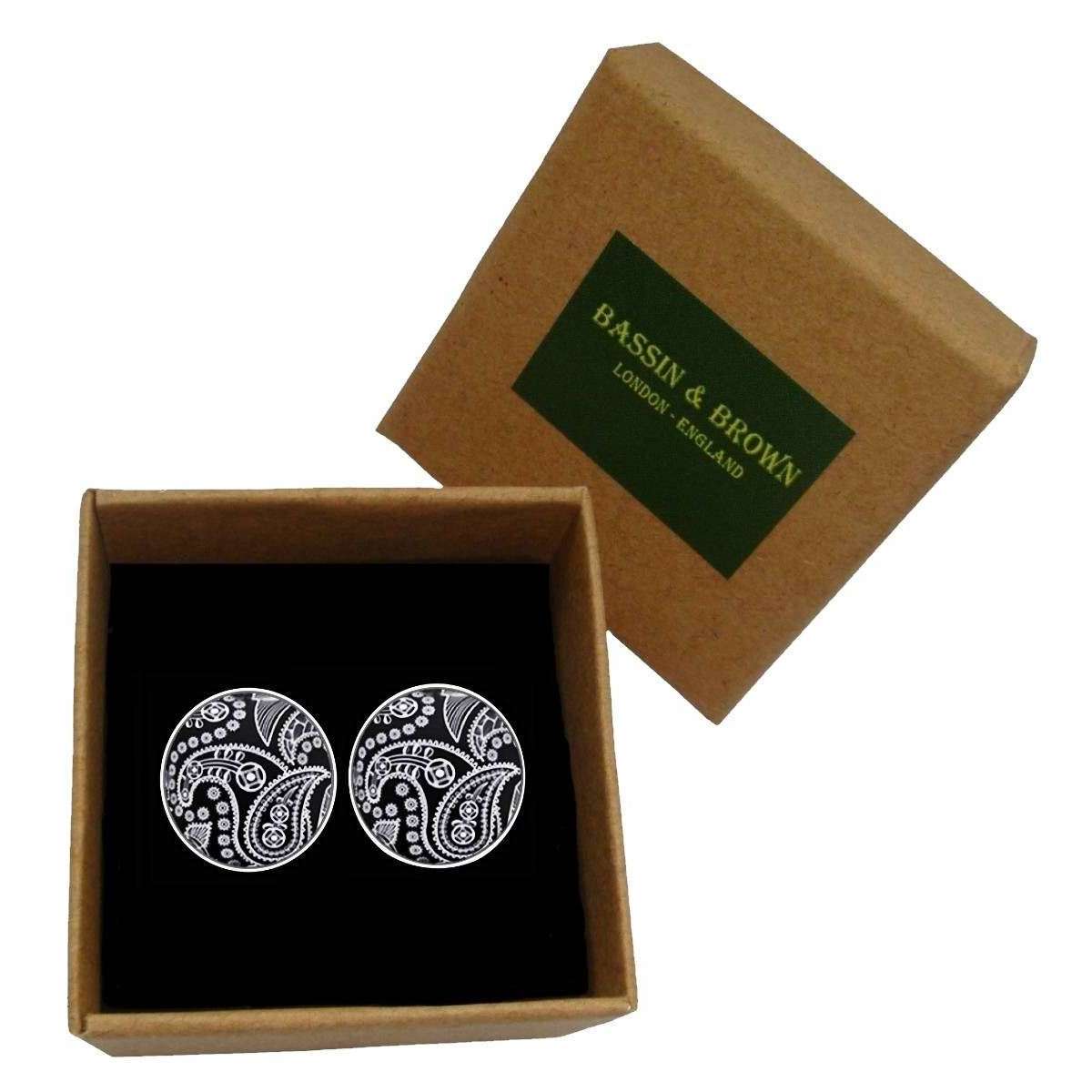 Fabriqués en métal plaqué du rhodium et en verre de cabochon se trouvent ces boutons de manchette en paisse des hommes noirs / blancs par le designer Bassin et Brown. Tous les boutons de manchette sont livrés avec Bassin et Brown Packaging. Les boutons de manchette Bassin et Brown Paisley - Black / White sont la décoration personnelle parfaite pour votre chemise. Avec ces boutons de manchette en paisse, vous pouvez ajouter un élément de style et de flair à votre tenue. Environ 16 mm de diamètre, ces boutons de manchette frappants sont enfermés dans un cabochon en verre durci rond et présentent une conception de raccord arrière pivotant qui facilite l'ajout et le retrait des chemises. Un article incontournable, ces boutons de manchette font un excellent cadeau pour l'homme à la mode!