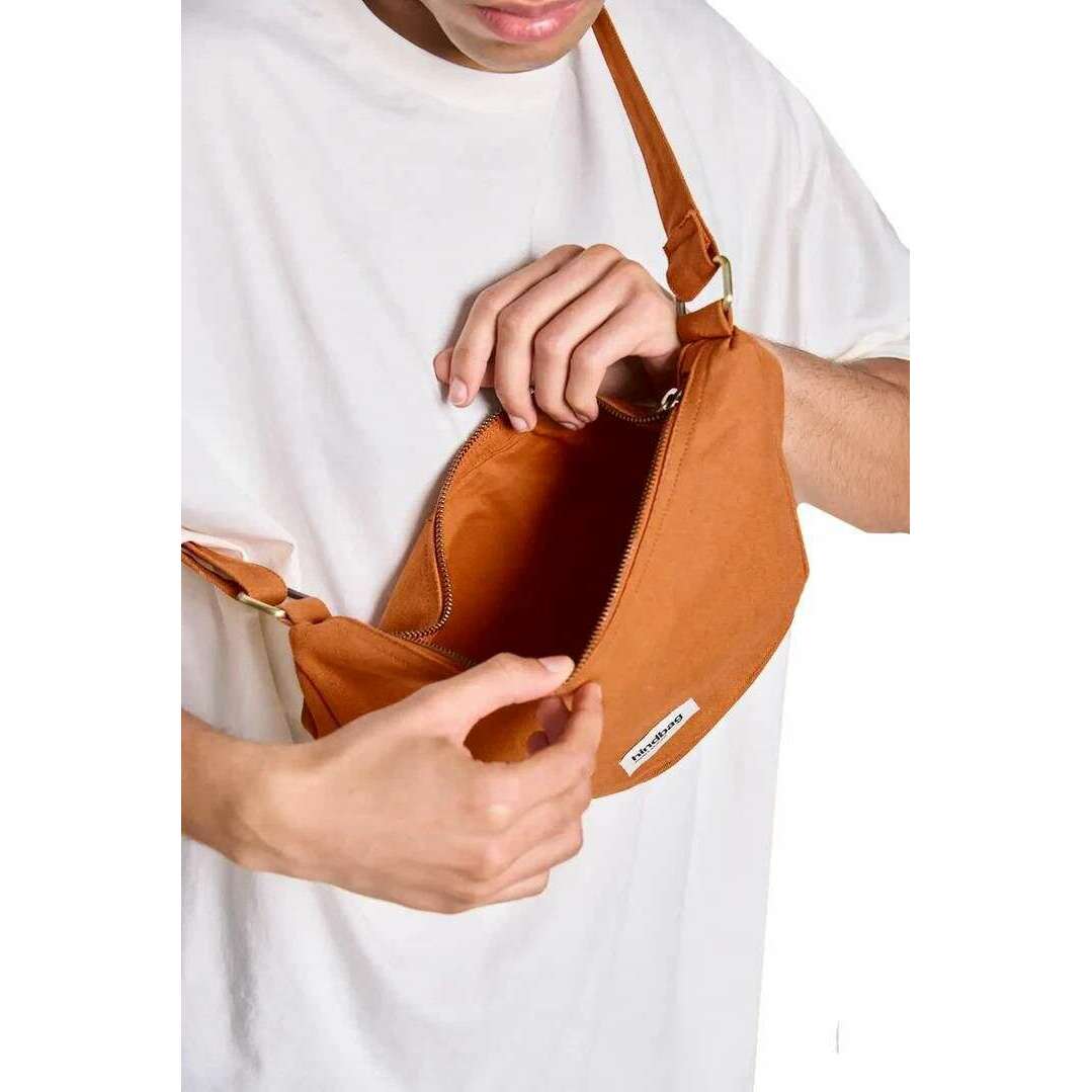 • Sangle organique, recyclée et réglable, ouverture zippée, poche arrière zippée