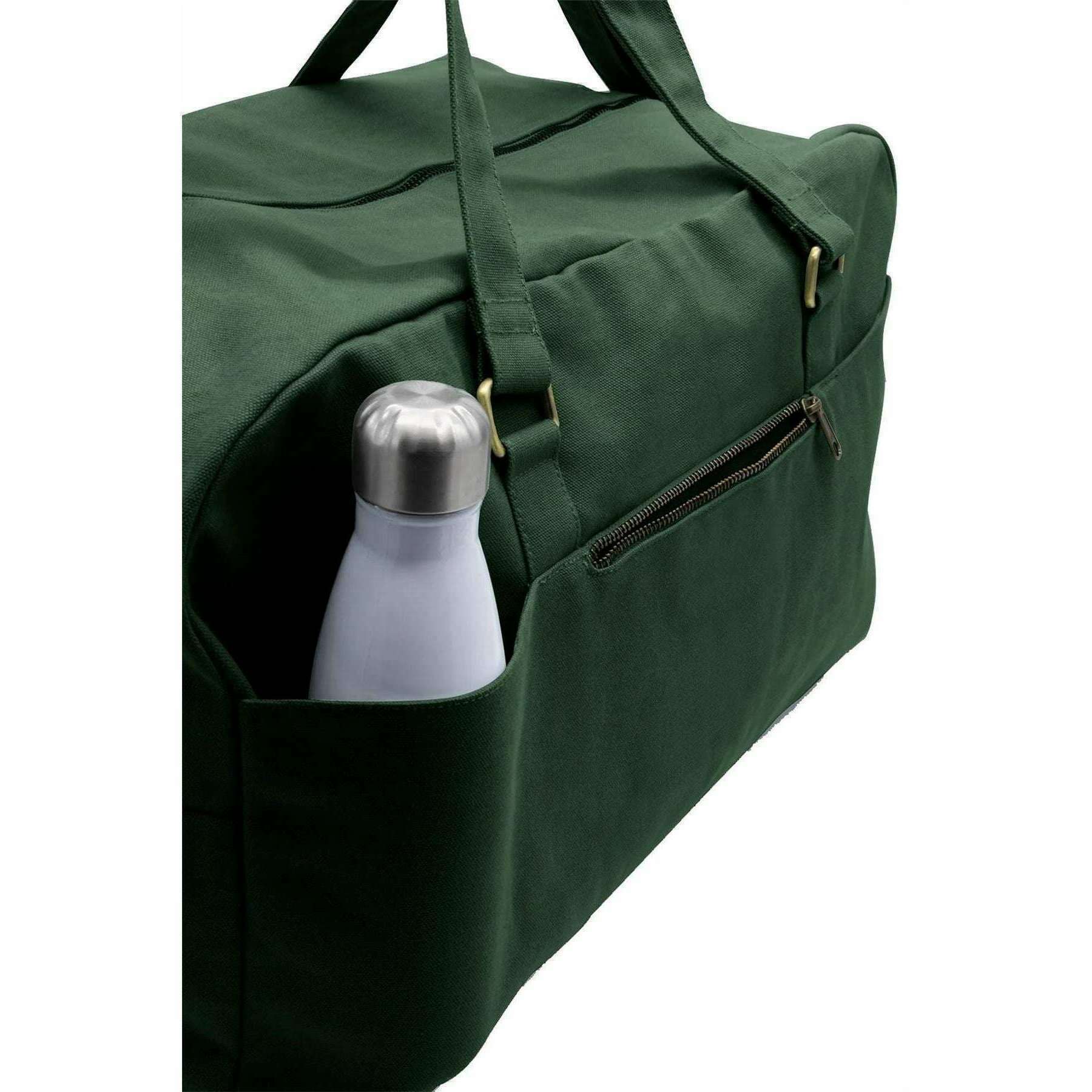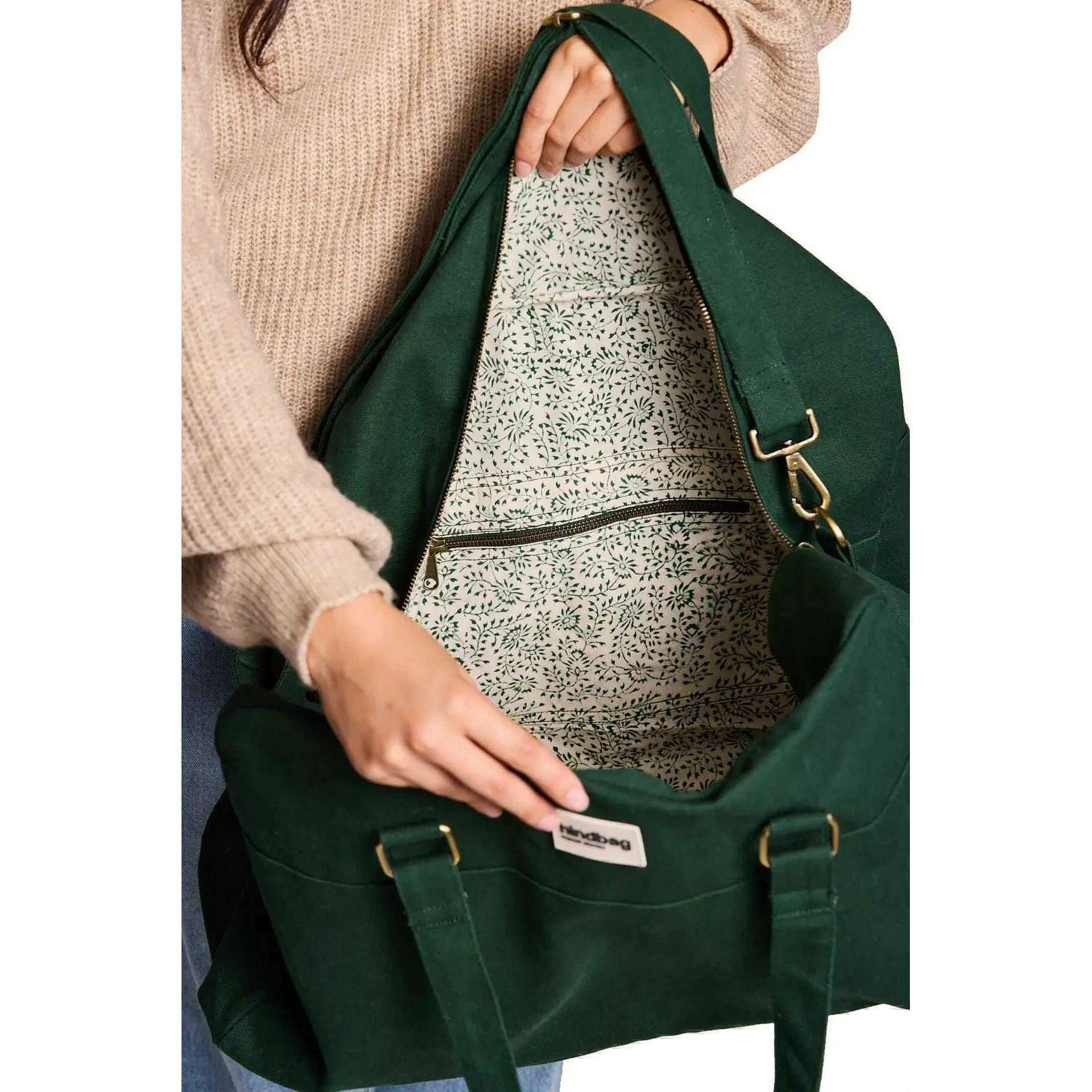 Ce grand sac de voyage unisexe Yves a été fabriqué à partir de coton 100% biologique, présenté dans une couleur verte et provient du sac postérieur de la marque. Il mesure 33 cm (hauteur) x 54 cm (largeur) x 24 cm (profondeur). Tous les sacs sont livrés avec un emballage de sac d'histoire. Le grand sac de voyage du record - Forest Green est une option spacieuse et respectueuse de l'environnement pour les voyageurs. Fabriqué à partir de coton biologique épais et certifié GOTS, ce sac propose plusieurs poches pour l'organisation, une fermeture de fermeture à glissière sécurisée et une doublure intérieure imprimée qui ajoute une touche d'élégance. Avec ses poignées et sa grande bandoulière réglable, ce sac peut être facilement transporté à la main ou sur l'épaule.