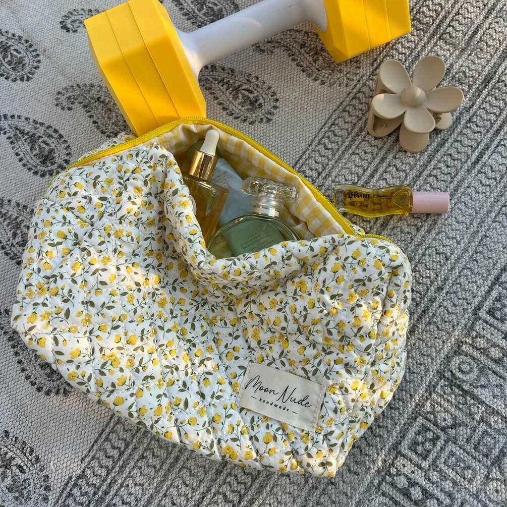 La créatrice Moon Nude vous propose ce sac pour femme 100% coton dans les tons blanc/jaune/beige. Il mesure 15 cm (hauteur) x 25 cm (largeur) x 15 cm (profondeur). Il est recommandé de laver à la main à l'eau froide avec un détergent doux, ou de laver à l'envers sur un cycle délicat. pour conserver ce sac en bon état. Tous les sacs sont livrés avec un emballage Moon Nude. La grande trousse de maquillage Moon Nude Buttercup - Blanc/Jaune/Beige est une nécessité absolue pour votre chambre ou votre sac de tous les jours. Cette trousse de maquillage est garantie de garder tous vos produits les plus utilisés ensemble et en sécurité, tout en étant élégante et chic avec son design matelassé fait à la main.