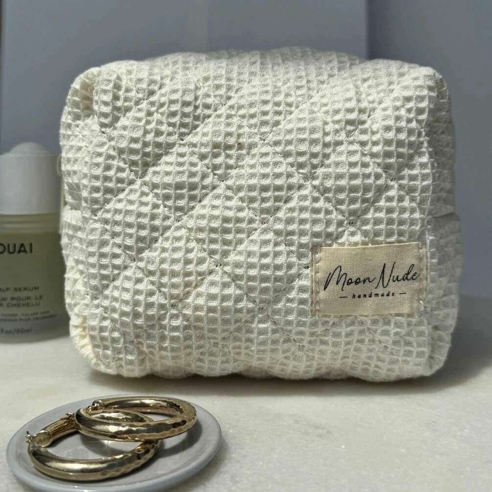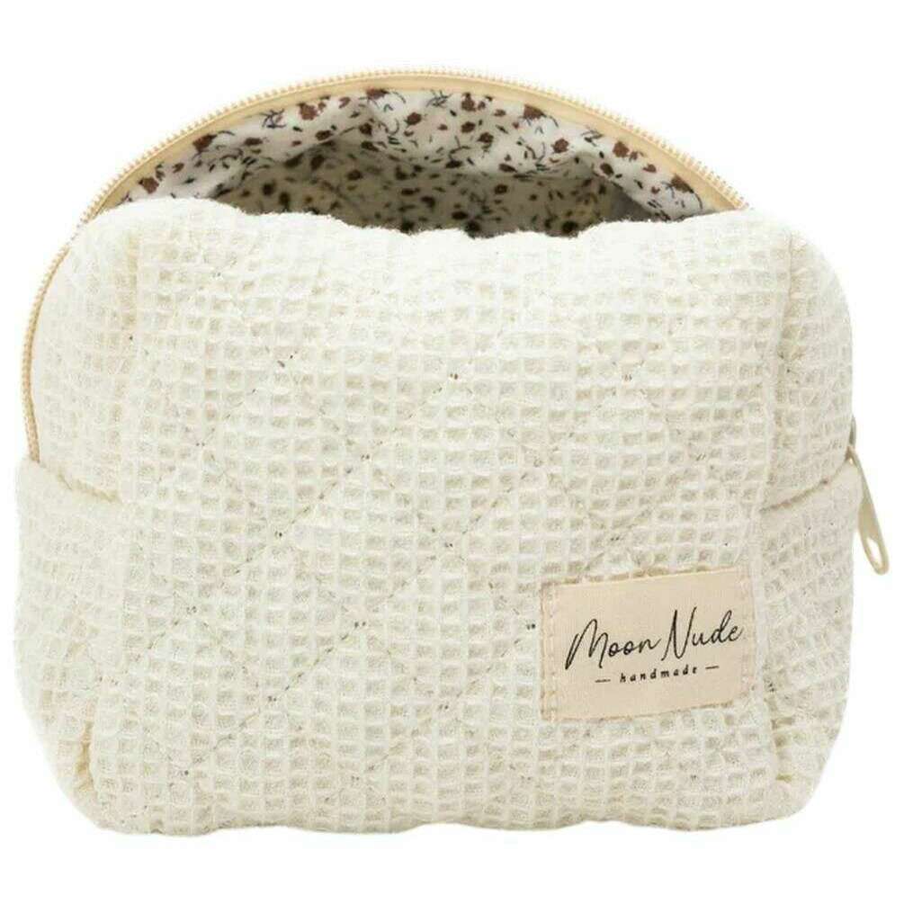 Utilisant de la crème 100% coton, cette mini trousse de maquillage de Moon Nude est parfaite pour les femmes et un incontournable. Il mesure 13 cm (hauteur) x 15 cm (largeur) x 11 cm (profondeur). Il est recommandé de laver à la main à l'eau froide avec un détergent doux, ou de laver à l'envers sur un cycle délicat. pour conserver ce sac en bon état. Tous les sacs sont livrés avec un emballage Moon Nude. La mini trousse de maquillage Moon Nude - Crème est une nécessité absolue pour votre chambre ou votre sac de tous les jours. Cette trousse de maquillage est garantie de garder tous vos produits les plus utilisés ensemble et en sécurité, tout en étant élégante et chic avec son design matelassé fait à la main.