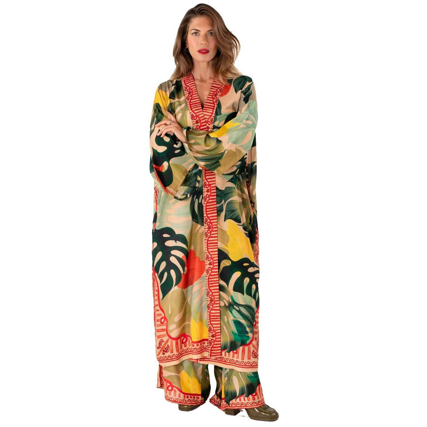 Robe Kimono Feuilles Exotiques Poudre - Vert/Beige/Jaune