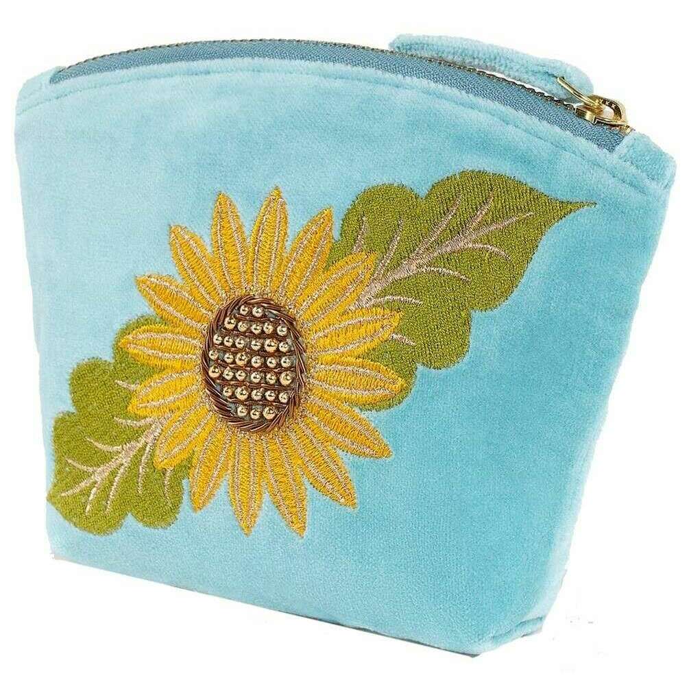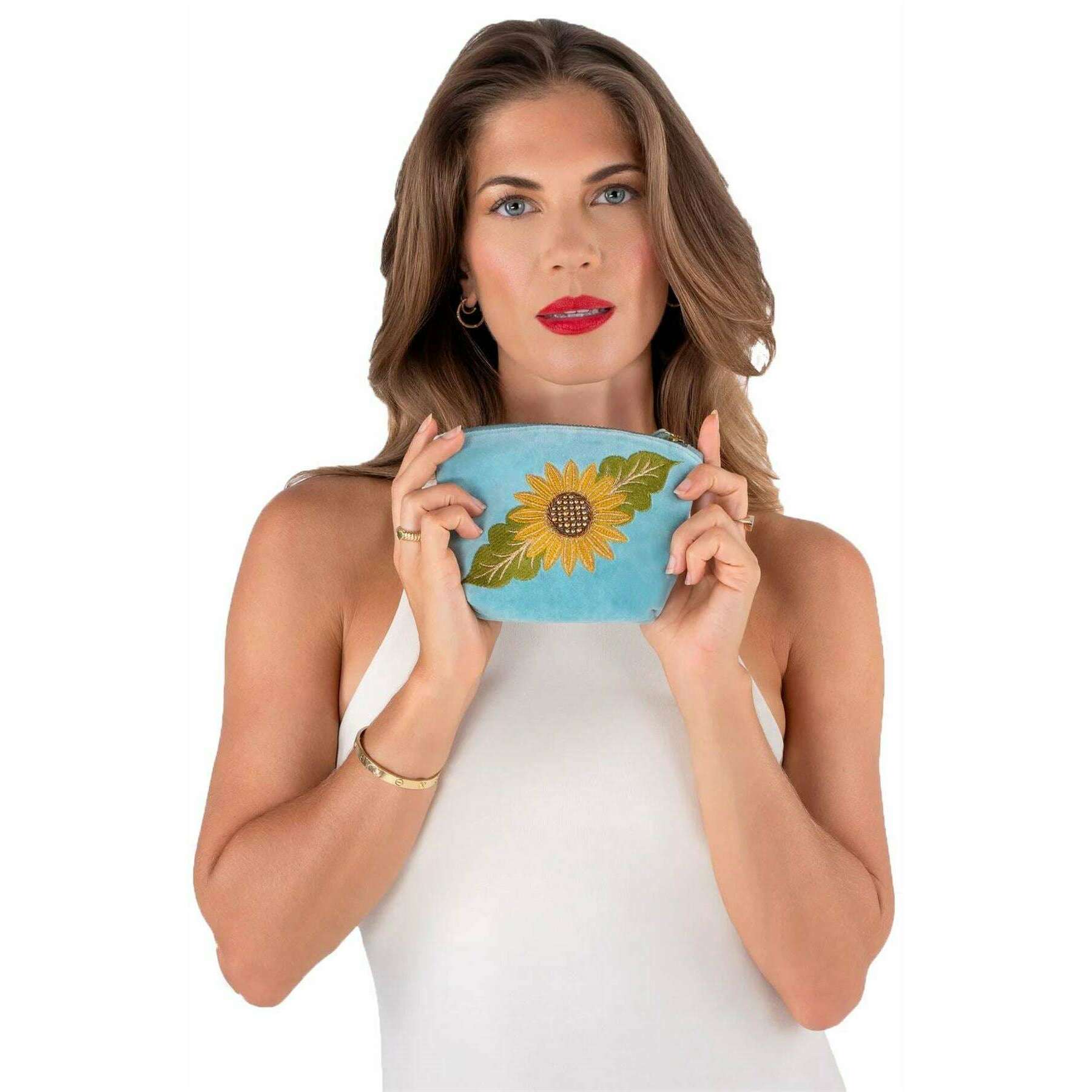 Mini pochette en velours brodé de tournesol d'été en poudre - Bleu/Jaune/Vert