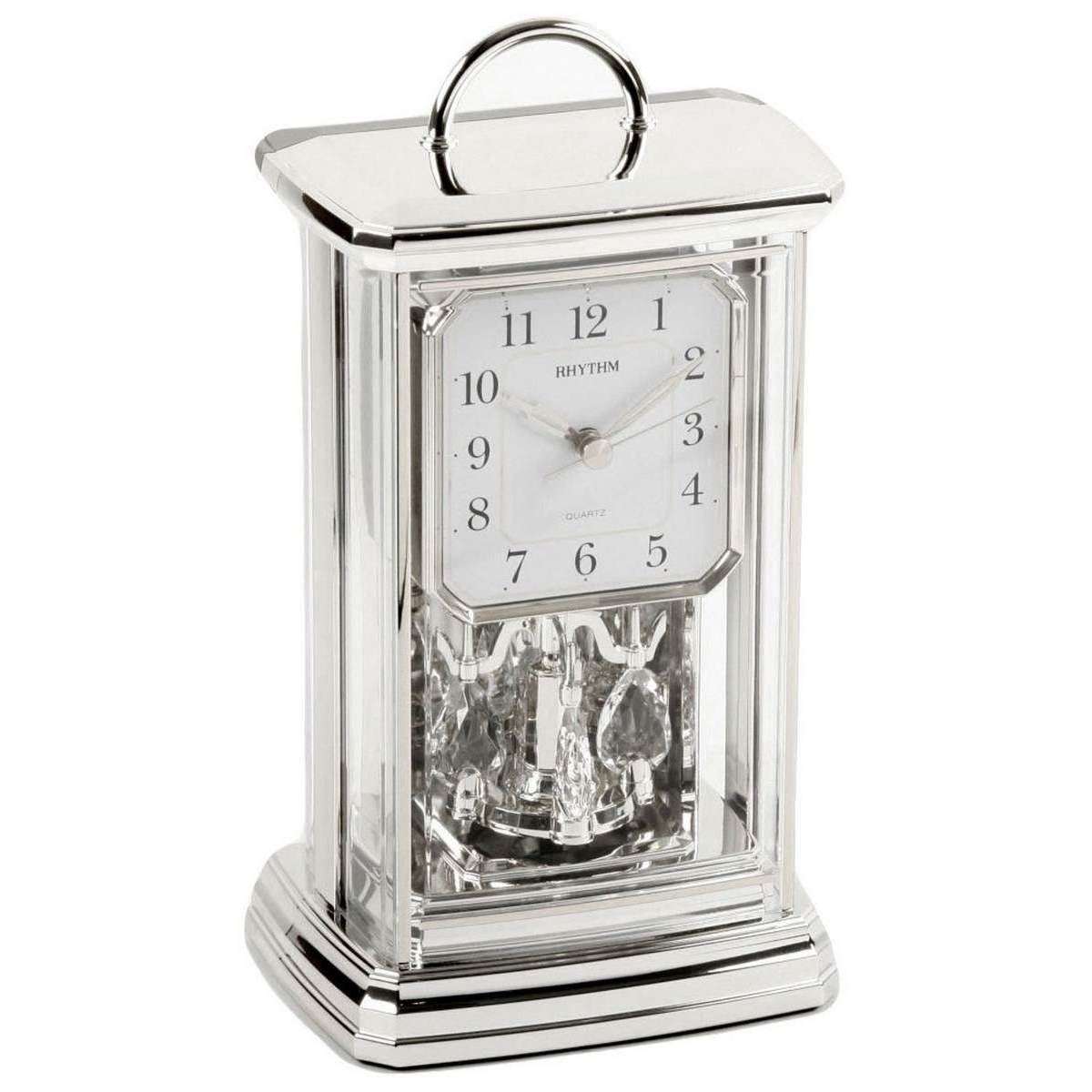 Présentation de cette horloge de manteau oblong à cadran arabe unisexe, il est fabriqué à partir de plastique de couleur argentée. Il mesure 26 cm (hauteur) x 14 cm (largeur) x 10,5 cm (profondeur). Toutes les horloges sont complètes avec un emballage de rythme. L'horloge du manteau oblong à cadran arabe rythmique - L'argent est une pièce luxueuse avec un design orné traditionnel qui comprend une poignée de transport arrondie et un pendule rotatif avec des cristaux. Il dispose également d'un cadran arabe carré en coin et nécessite 2 batteries X AA.