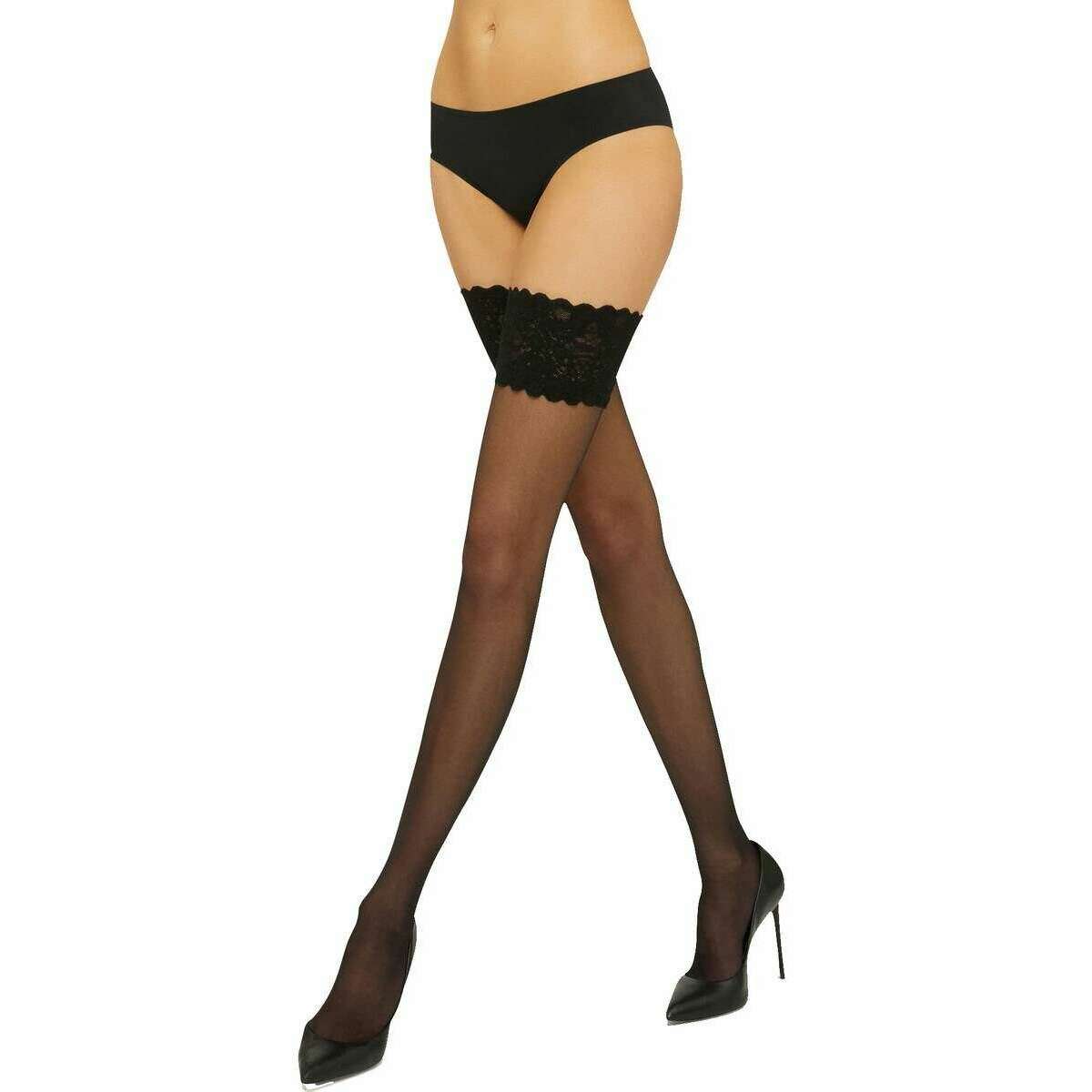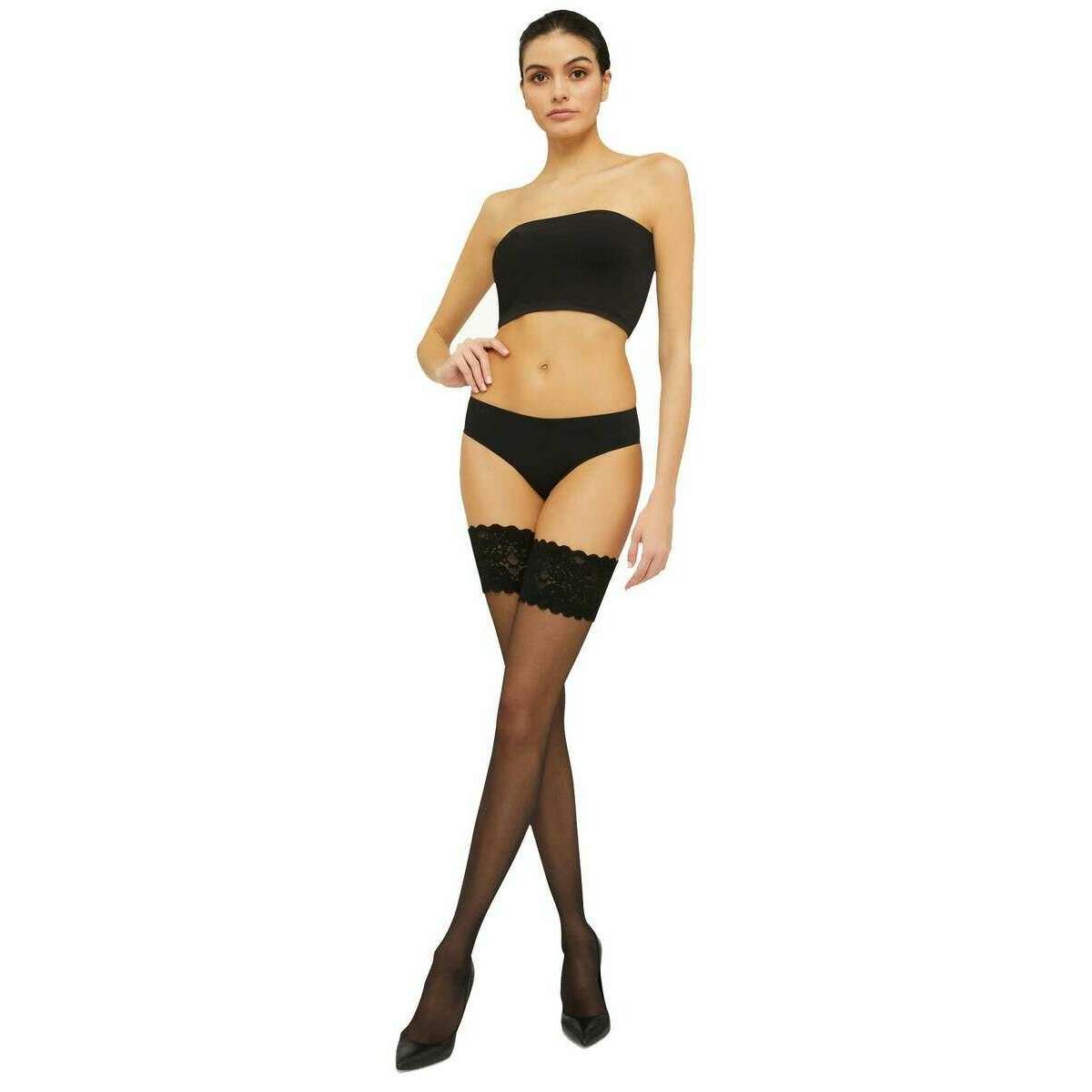 • Grip optimal, groupe siliconisé, belle bande en dentelle avec motif floral, 20 deniers, renforcement des orteils presque invisible