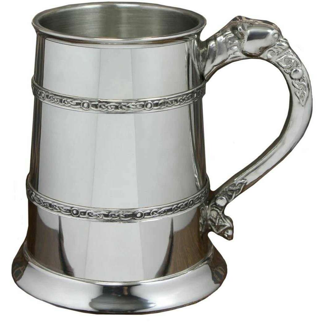 Engels tinnen bedrijf 1pt Celtic Lion Handle Tankard - zilver