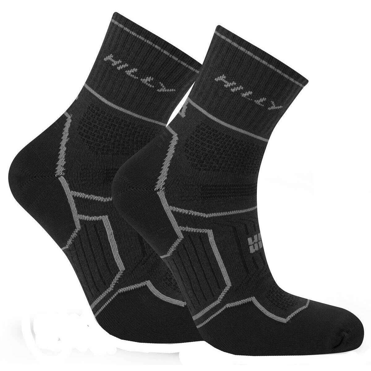 Deze unisex Twin Skin-sklet-sokken zijn gemaakt van 50% polyamide (nylon), 22% polyester (Drirelease®), 21% polyamide (Q-Skin®), 4% katoen (Drirelease®) en 3% elastaan ​​(Lycra® Sport), te zien in een zwarte kleur en zijn van het merk Hilly. Ook de zwarte/antracietgrijze sokken zijn ontworpen in een blokpatroon, alle sokken worden compleet geleverd met heuvelachtige verpakkingen. De heuvelachtige sokken met dubbele huid - zwart/antracietgrijs ideaal voor sport, hebben een Q -Skin® microvezellaag die vocht van binnenuit naar de buitenkant overbrengt om een ​​droge slijtage te garanderen die geen ongemak veroorzaakt en een DRIREASE® E.C.O. buitenste laag die is gemaakt van biologisch katoen met een geweldige droogsnelheid. De ademende geventileerde top zorgt ervoor dat je voeten niet oververhit raken en ongemak veroorzaken en de booggreep top, plat onder teen en y-vorm hiel voorkomt slippen en schuren. De Lycra® sportmateriaal en middelgrote demping zorgt voor een blijvend comfort, pasvorm, vorm en prestaties, zodat deze sokken zijn geweldige functies voor de komende jaren zullen behouden. Ze zijn de ultieme dubbele laag, anti-blister paar sokken, perfect voor elke hardloper.