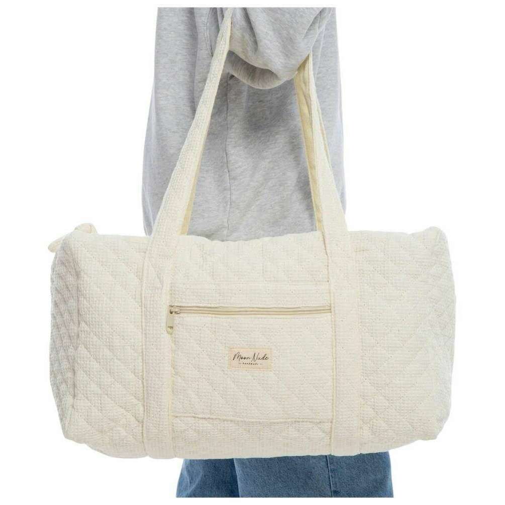 Deze crèmekleurige grote plunjezak voor dames, aangeboden door het merk Moon Nude, is gemaakt van 100% katoen. De afmetingen zijn 30 cm (hoogte) x 50 cm (breedte) x 28 cm (diepte). Het wordt aanbevolen om met de hand te wassen in koud water met een mild wasmiddel, of binnenstebuiten machinaal te wassen op een delicate cyclus. om deze tas in goede staat te houden. Alle tassen worden compleet geleverd met een maannaaktverpakking. De Moon Nude Large Duffel Bag - Cream heeft een prachtig handgemaakt gewatteerd ontwerp. Deze tas heeft een buitenvak met ritssluiting, een ruim interieur en twee grote handvatten, perfect voor een weekendje weg of het meenemen van veel spullen.