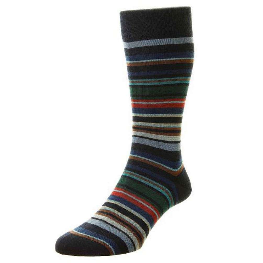 Pantherella Quakers overal op multi -streep merinowolsokken - marine