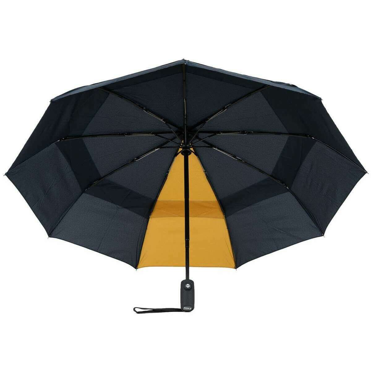 Roka Waterloo gerecycled nylon paraplu - middernacht blauw/maïs geel