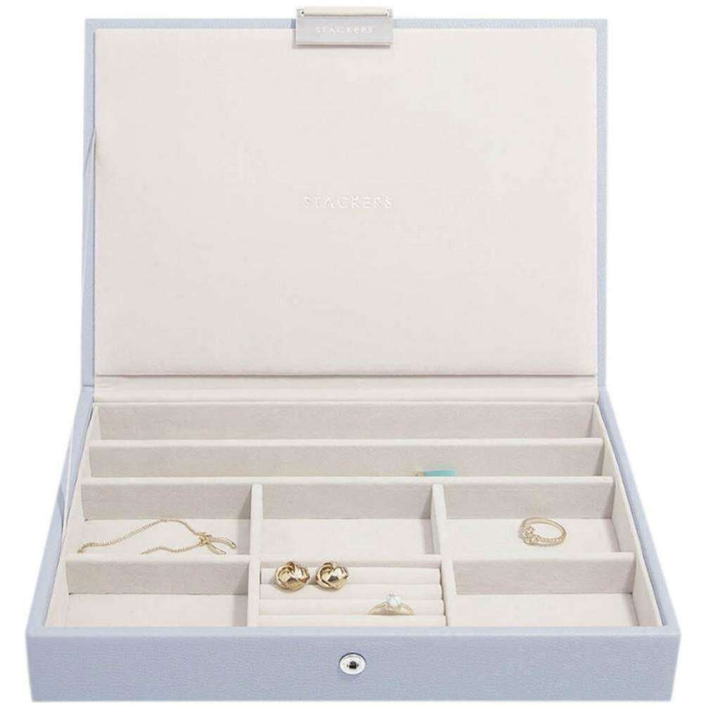 Designer Stackers heeft u deze faux leer- en fluwelen juwelenbox voor dames gebracht met behulp van lavendeltonen. Het meet 25 cm (lengte) x 18 cm (breedte) x 4,2 cm (diepte). Alle sieradendozen worden compleet geleverd met Stackers -verpakkingen. Het klassieke juweliersdoos van de Stackers - lavendel kan moeiteloos worden gestapeld met andere uitstekende stukken uit de Stackers -collectie om een ​​aangepaste juweliersbox te maken die geschikt is voor uw accessoires. Als alternatief werkt het als een stand-alone juwelenbox die perfect is voor het organiseren van uw ringen, oorbellen en kettingen. Deze prachtige doos is gemaakt met materialen van hoge kwaliteit en ziet er elegant en klassiek uit en is essentieel voor vrouwen die graag accessorise houden.