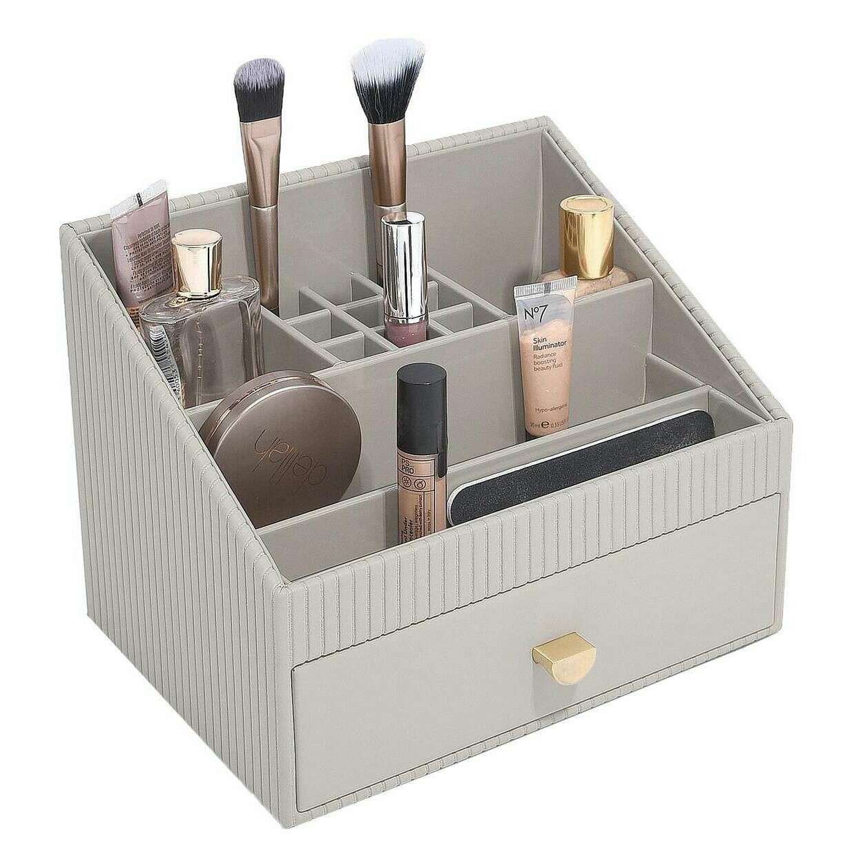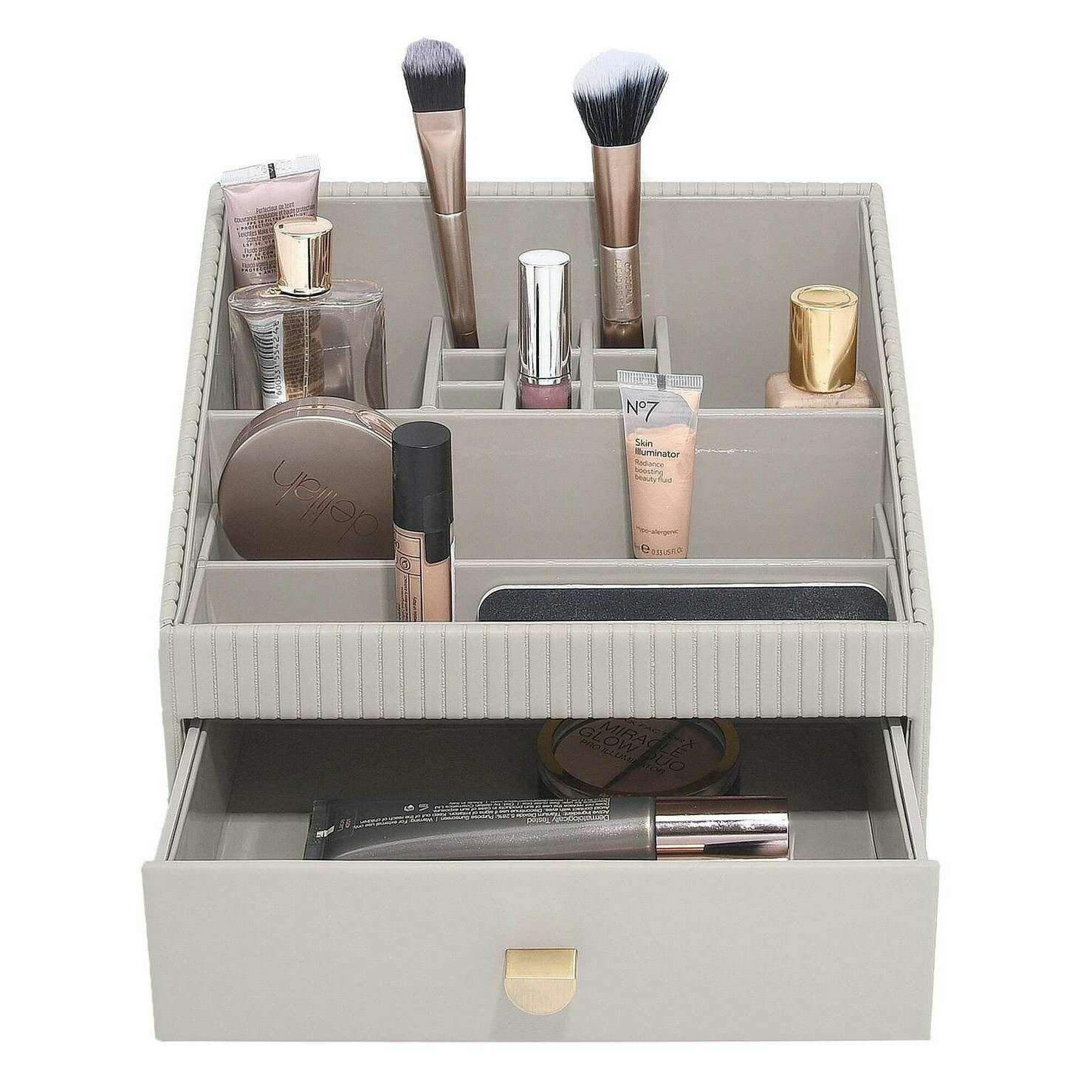 Deze kalksteengrijze klassieke make-up organizer voor dames, aangeboden door het merk Stackers, is gemaakt van kunstleer en pvc. De afmetingen zijn 19 cm (hoogte) x 25 cm (breedte) x 18 cm (diepte). Alle make-up organizers worden compleet geleverd met een stapelverpakking. De Stackers Classic Makeup Organizer - Limestone Grey beschikt over meerdere compartimenten voor uw make-up of huidverzorgingsproducten. Deze prachtige geribbelde grijze make-up organizer heeft een lade voor grotere producten, perfect om georganiseerd te blijven en ruimte te besparen!