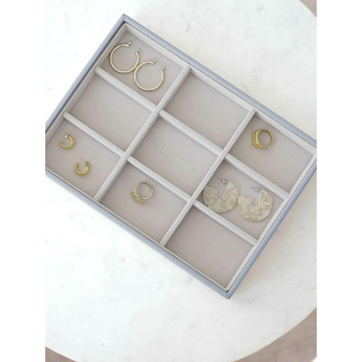 Ontwerper Stackers heeft dit damessieradendoosje van kunstleer en fluweel voor je uitgebracht in donkerblauwe tinten. De afmetingen zijn 3,7 cm (hoogte) x 25 cm (breedte) x 18 cm (diepte). Het wordt aanbevolen om deze sieradendoos schoon te vegen om deze in goede staat te houden. Alle sieradendoosjes worden compleet geleverd met stapelverpakking. De Stackers Classic Statement Layer - Dusky Blue is slim gemaakt en ontworpen om al je oorbellen, ringen of haarclips perfect vast te houden. Het kan aan elk ander klassiek sieradenbakje worden toegevoegd om een ​​sieradendoosje te creëren, maar kan ook op zichzelf worden gebruikt. U hoeft geen concessies te doen aan de organisatie.