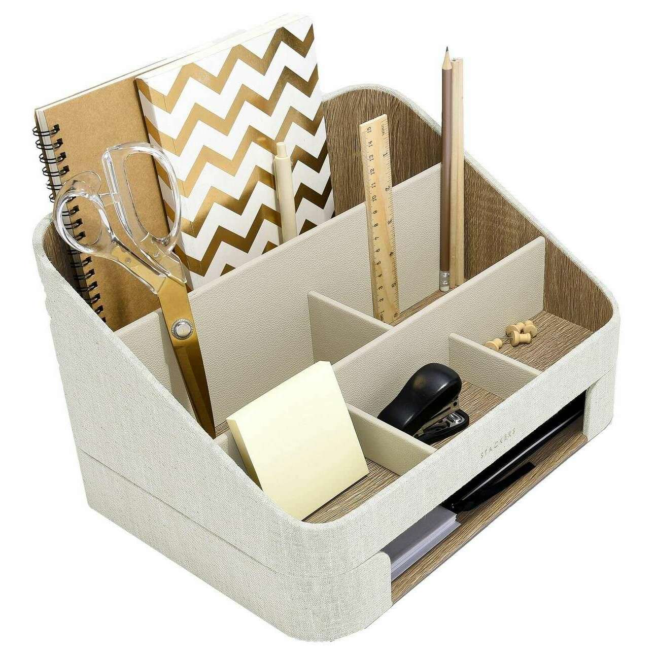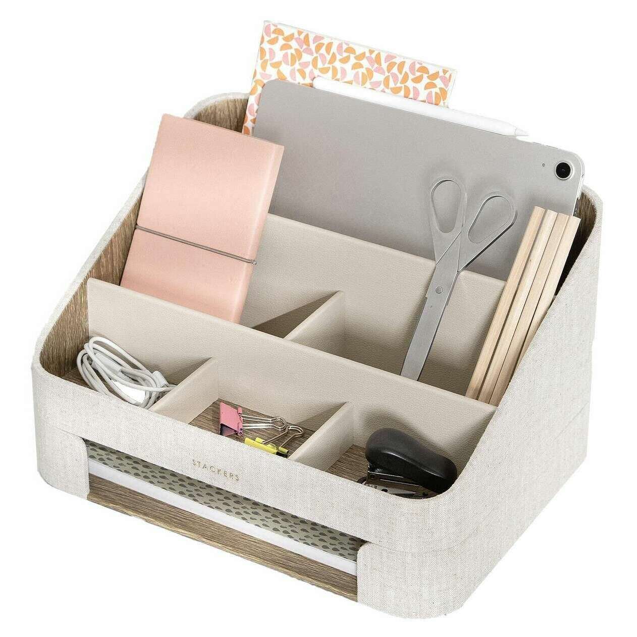 Deze havermoutbeige/linnenbeige bureau-organizerset voor dames, aangeboden door het merk Stackers, is gemaakt van kunstleer. De afmetingen zijn 20 cm (hoogte) x 25 cm (breedte) x 33 cm (diepte). Alle bureauaccessoires worden compleet geleverd in een stapelverpakking. De Stackers Desk Organizer Set - Oatmeal Beige/Linnen Beige heeft een prachtig beige en bruin design. Deze bureau-organizer heeft veel vakken voor schrijfwaren, notitieboekjes en nog veel meer snuisterijen. Wordt compleet geleverd met een brievenbakje voor extra opbergruimte.