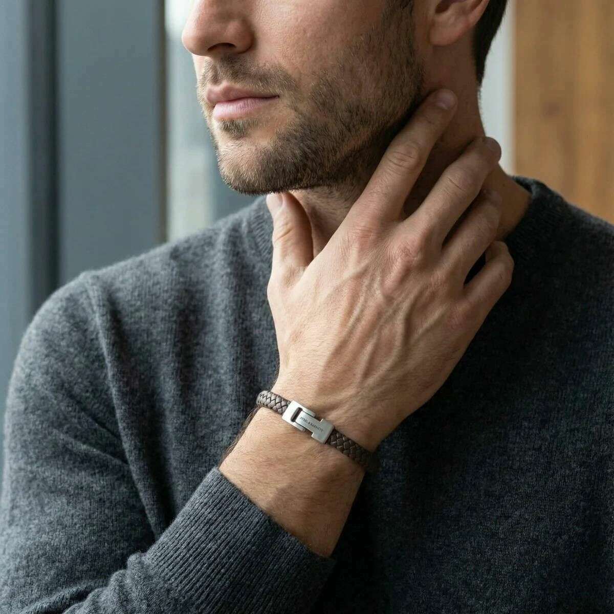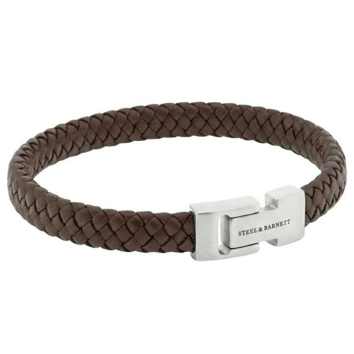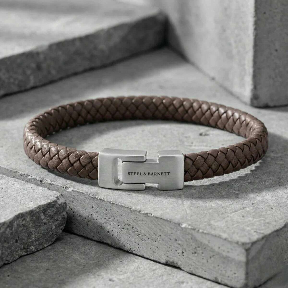 Maak kennis met deze Archie gevlochten leren herenarmband van Steel & Barnett, gemaakt van 100% nappaleer en roestvrij staal in een bruine kleur. Alle armbanden worden compleet geleverd met een stalen en barnett-verpakking. De Steel & Barnett Archie gevlochten leren armband - bruin belichaamt de perfecte balans tussen eenvoud en elegantie. De gladde band van 8 mm is vakkundig met de hand gemaakt van echt nappaleer en zorgt voor een strakke, minimalistische esthetiek die geschikt is voor elke stijl. Het ontwerp wordt versterkt door een kenmerkende geborstelde zilveren sluiting, fijn gegraveerd met het STEEL & BARNETT-logo, wat een subtiel vleugje onderscheiding biedt. De armband is gebouwd voor een lange levensduur en is voorzien van een hoogwaardige 316L roestvrijstalen sluiting, geroemd om zijn duurzaamheid en corrosiebestendigheid. De magnetische sluiting zorgt voor moeiteloos dragen en zorgt de hele dag voor een veilige en comfortabele pasvorm. De Archie is veelzijdig en verfijnd en gaat naadloos over van formele gelegenheden naar casual settings, waardoor een laagje ingetogen verfijning aan elke outfit wordt toegevoegd.