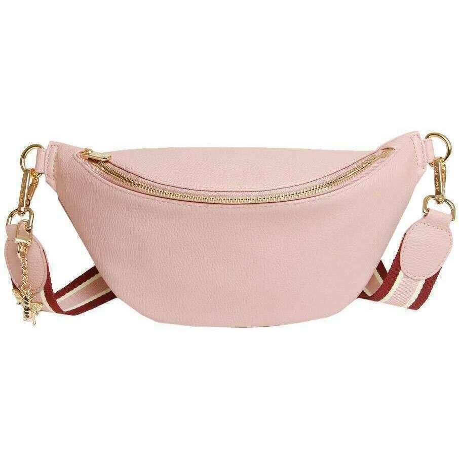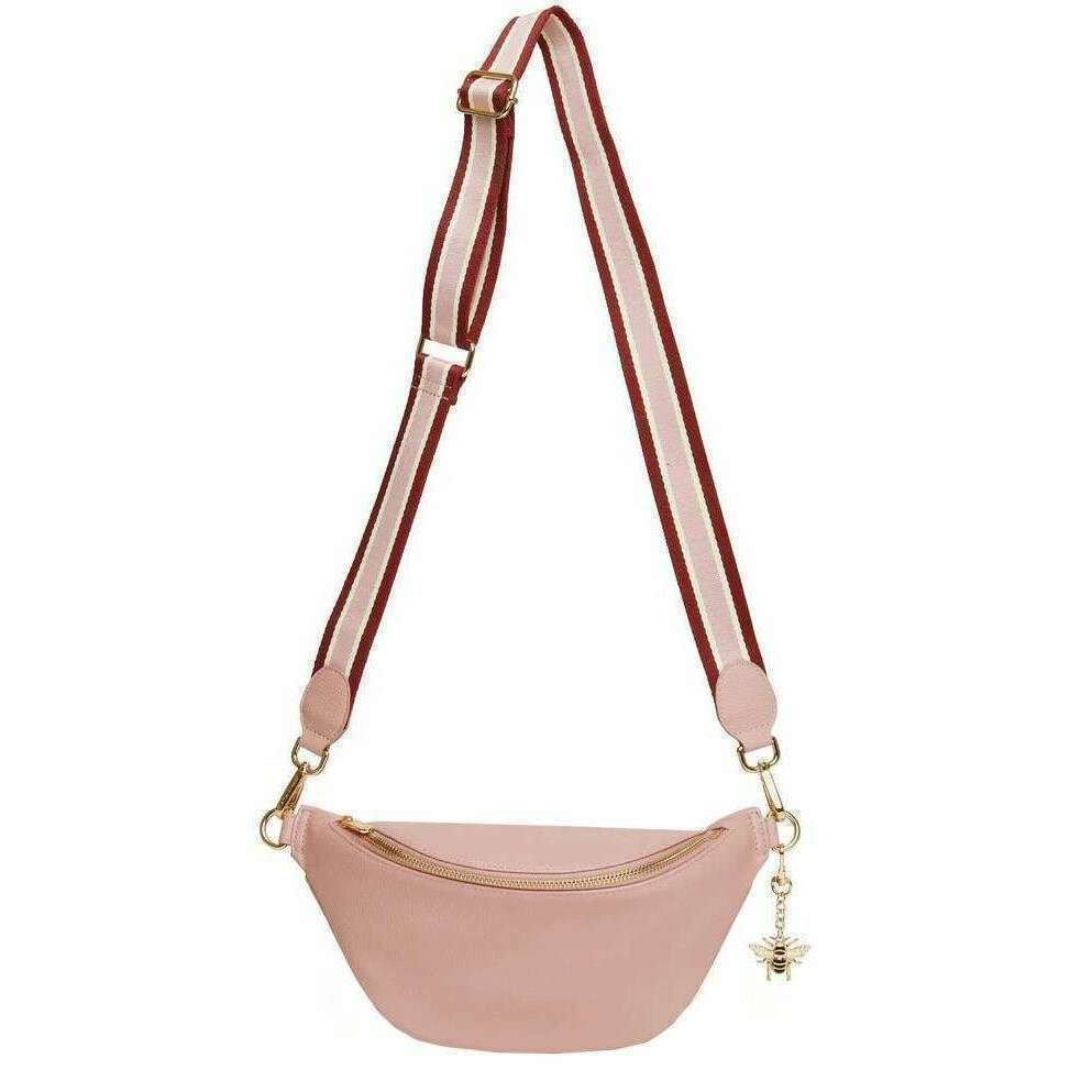 This well made women's banana bag from Alice Wheeler London comes in a pink colour and is manufactured from 100% vegan faux leather. It measures 14cm(height) x 29cm(width) x 9cm(depth). It is recommended to wipe clean with damp cloth to keep this bag in good condition. All the bags come complete with alice wheeler london packaging. The Alice Wheeler London Banana Bag - Pink is the perfect choice of you are looking for a more casual accessory, but that doesn’t mean it sacrifices elegant style. It is fitted with a tri-colour strap which is easily adjustable to find the ideal carrying comfort. Inside is a good-sized main compartment as well as a smaller zipped pocket which is perfect for storing your more valuable items. Finished with a gorgeous Honey Bee charm this piece will certainly become a staple.