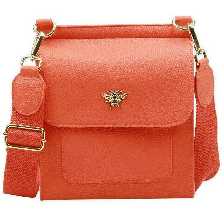 Perfect for women is this Alice Wheeler London orange bloomsbury crossbody bag, it is also made from 100% vegan faux leather. It measures 18cm(height) x 20cm(width) x 12cm(depth). All the bags come complete in alice wheeler london packaging. The Alice Wheeler London Bloomsbury Crossbody Bag - Orange will make a stunning and stylish everyday bag or will accessorise your evening outfit when at a more formal event. Fitted with an adjustable cross body strap you can find a length that best suits you for comfortable carrying. The Bloomsbury offers a good-sized main section and is secured with a flap and magnetic clasp closure. The iconic and elegant Bumble Bee logo rounds off this gorgeous design as well as named branding on the back.