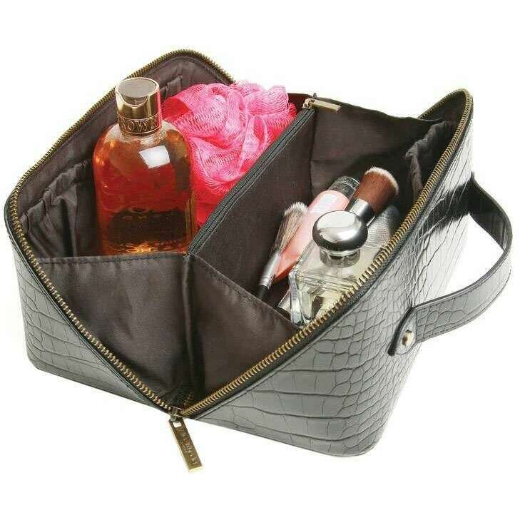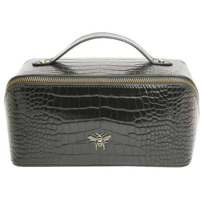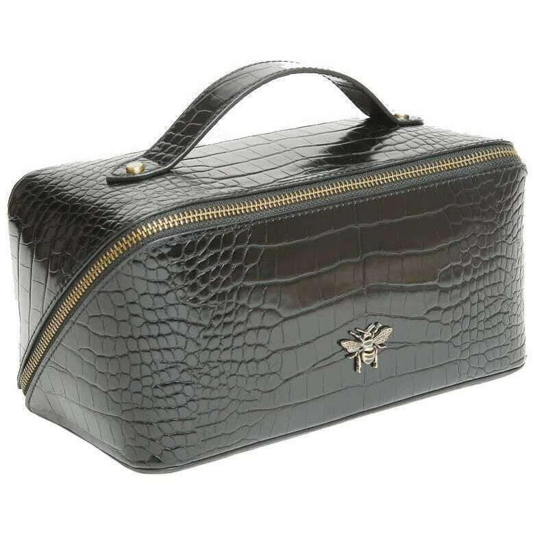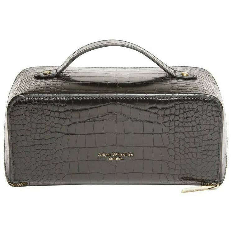 Introducing this women's luxury train case by Alice Wheeler London, it is manufactured from 100% vegan faux leather in a black croc colour. It measures 12cm(height) x 24cm(width) x 12cm(depth). All the bags come complete in alice wheeler london packaging. The Alice Wheeler London Luxury Train Case - Black Croc is the perfect travel case for toiletries when going away or storage for your make-up and beauty products. The luxury design features a zipped closure and opens up to a large main compartment with internal pockets for your smaller essentials. The top handle makes it effortless to transport and the stylish branding on both sides adds an elegant touch.