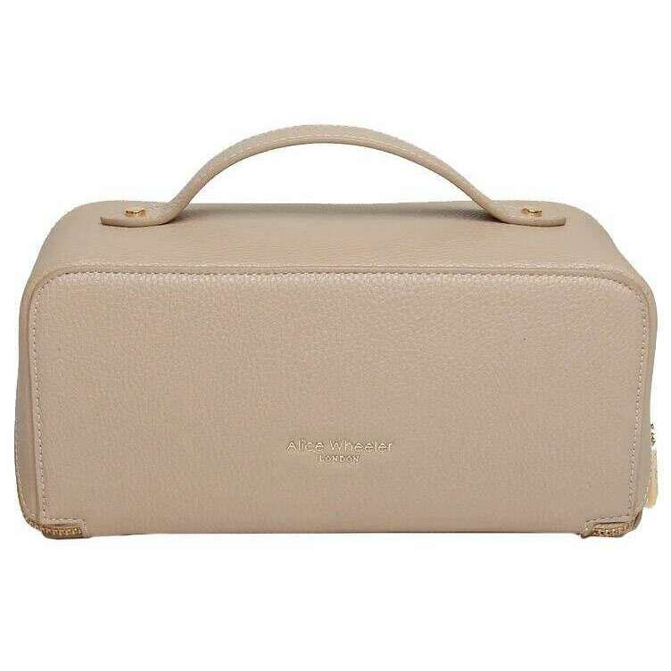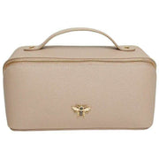 Perfect for women is this Alice Wheeler London stone beige mini luxury train case, it is also made from 100% vegan faux leather. It measures 9.5cm(height) x 18cm(width) x 9.5cm(depth). All the bags come complete in alice wheeler london packaging. The Alice Wheeler London Mini Luxury Train Case - Stone Beige is a mini version of the popular Train case and is a stylishly cute way to carry your essential toiletries, make-up or other travel essentials. Inside is fully lined and includes internal pockets for your smaller bits plus as a dual main section so it is easy to organise your things. Everything is seals inside securely with its zipped closure and is finished with the iconically beautiful bee embellishment.