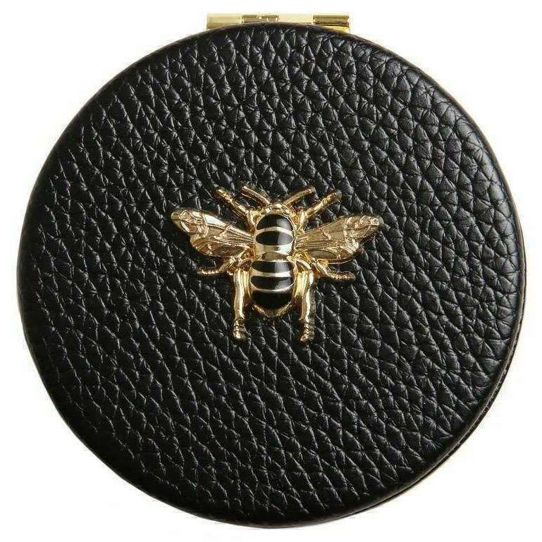 This women's round compact mirror by the brand Alice Wheeler London is made from 100% vegan faux leather and is showcased in black. It measures 7cm(height) x 7cm(width). It is recommended to wipe clean with damp cloth to keep this compact in good condition. All the compacts come complete in alice wheeler london packaging. The Alice Wheeler London Round Compact Mirror - Black is the perfect accessory that is essential to carry around with you in your handbag. The beautifully iconic bee embellishment adorns the front of it. Inside is a 7x magnifying mirror with a twin gold-toned metal frame which is ideal for those day to day touch ups.