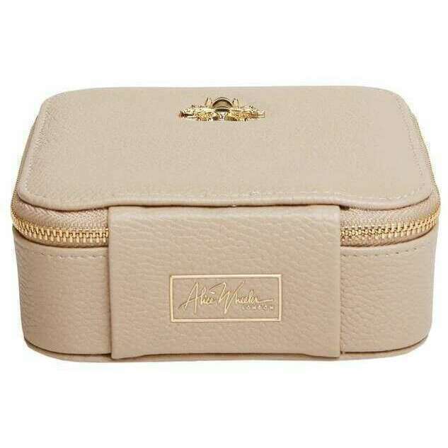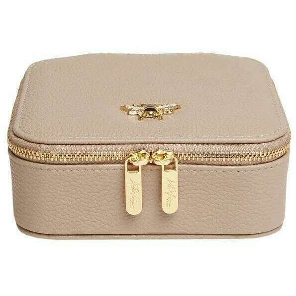 Using beige vegan faux leather and faux suede interior, this travel jewellery box by Alice Wheeler London is perfect for women and a must have. It measures 13.5cm(height) x 13.5cm(width) x 5cm(depth). All the jewellery boxes come complete with alice wheeler packaging. The Alice Wheeler London Travel Jewellery Box - Stone Beige will become an all-time favourite with its great organisation and perfect size to slip into any bag whatever the occasion. Featuring a ring roll great for earrings and your most worn rings, 3 small compartments for smaller pieces, 2 larger side compartments for necklaces and bracelets and a mirror on the lid. The gold-toned zipper closure offers security and luxury. Complete with the signature honeybee logo adorned to the top of this case.