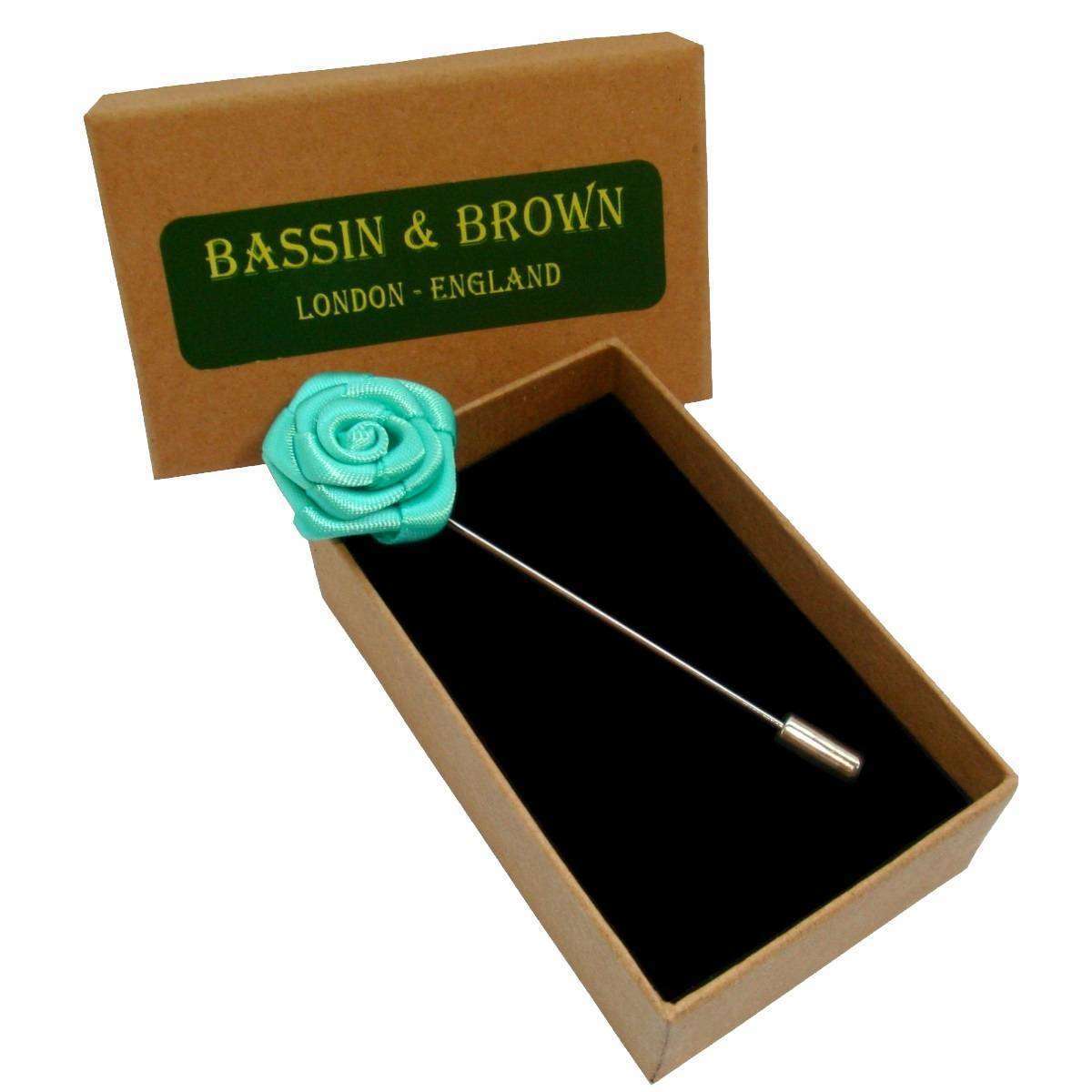 Manufactured from rhodium plate and satin is this mint green men's rose flower lapel pin by the designer Bassin and Brown. It measures 8cm(height). All the lapel pins come complete in bassin and brown recyclable box. The Bassin and Brown Rose Flower Lapel Pin - Mint Green has been luxuriously designed for any formal occasion or weddings. This pin will add a touch of class to your outfit and will not overpower as it is perfectly sized.