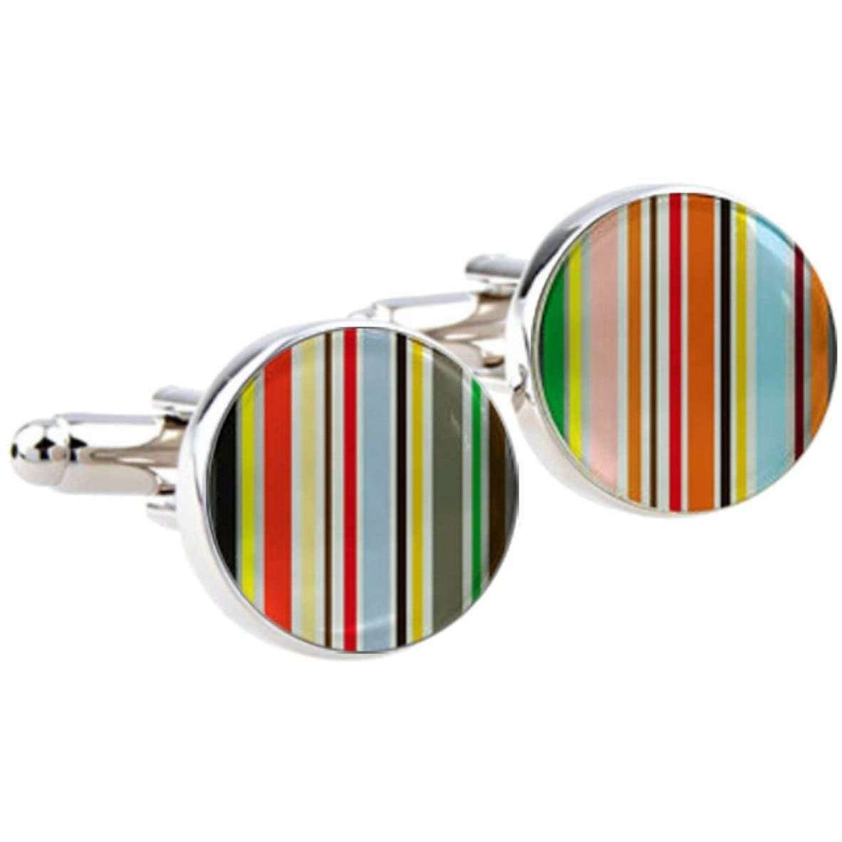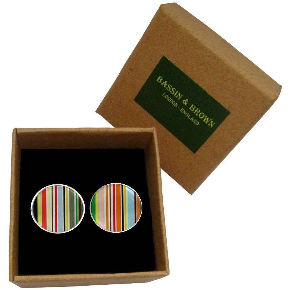 These men's stripe cufflinks by the brand Bassin and Brown are made from rhodium plate and photo glass cabochon and are showcased in multi-colour. All the cufflinks come complete in a bassin and brown presentation box. The Bassin and Brown Stripe Cufflinks - Multi-colour offer a luxurious touch to any gentleman’s formal attire. Flair and style go hand in hand with these stunning cufflinks which will look the part on any occasion, finishing off your shirt or jacket. Fitted with a simplistic swivel back they are nice and easy to take on and off making their wear effortless.