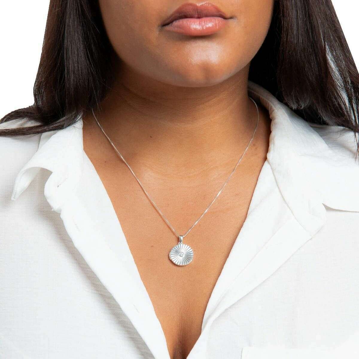 Perfect for women is this Beginnings silver sunburst round locket pendant, it is also made from 100% recycled sterling silver with gemstone. It measures 41cm-46cm(length). All the pendants come complete with beginnings presentation box. The Beginnings Sunburst Round Locket Pendant - Silver will be your most loved piece in your collection due to the personalised inside creating a sentimental touch and the sunburst motif giving a lustrous shine. The 41 to 46 cm length allows for adjustment and a fit that is just right for you. Made from skin safe recycled sterling silver gives a high-quality and luxurious finish.
