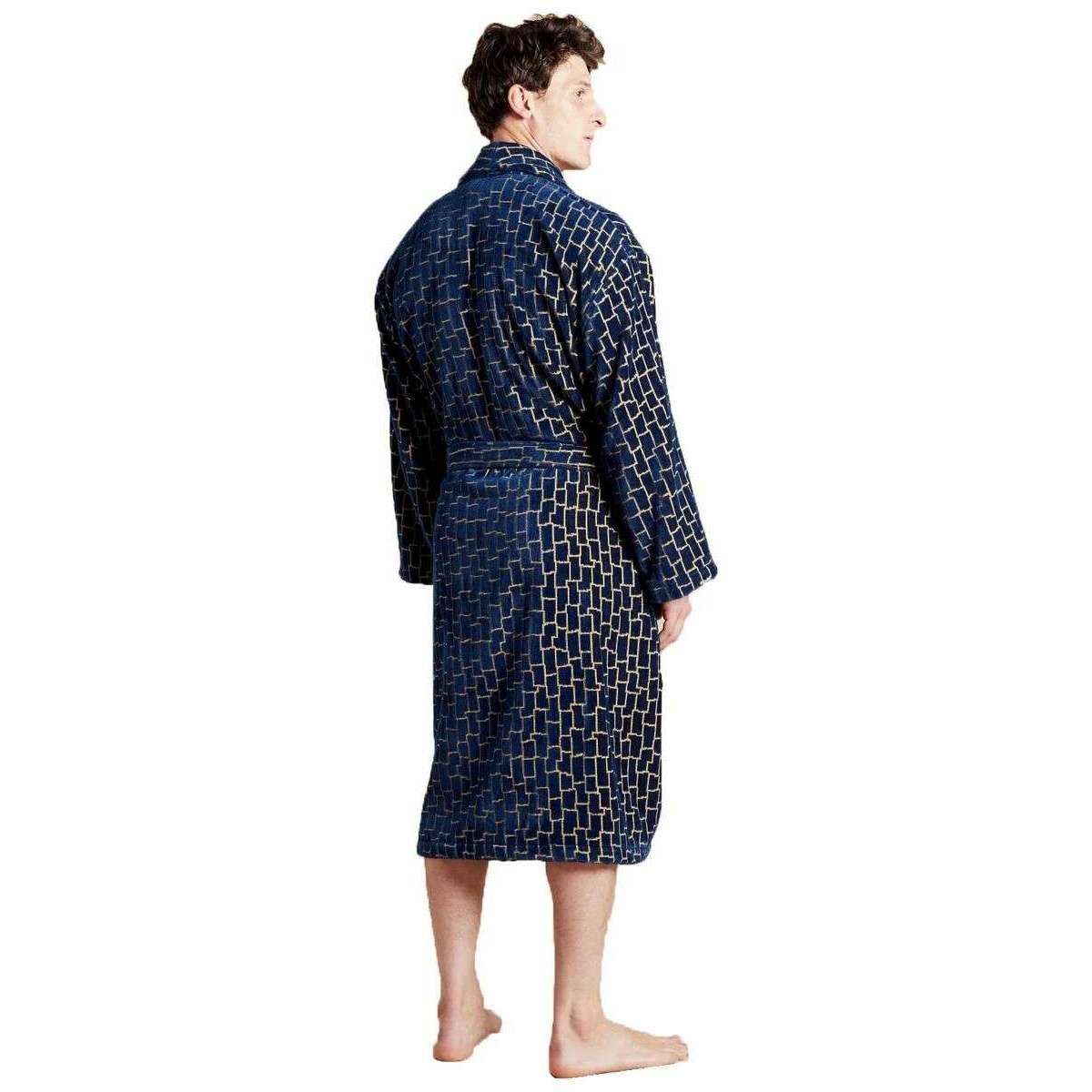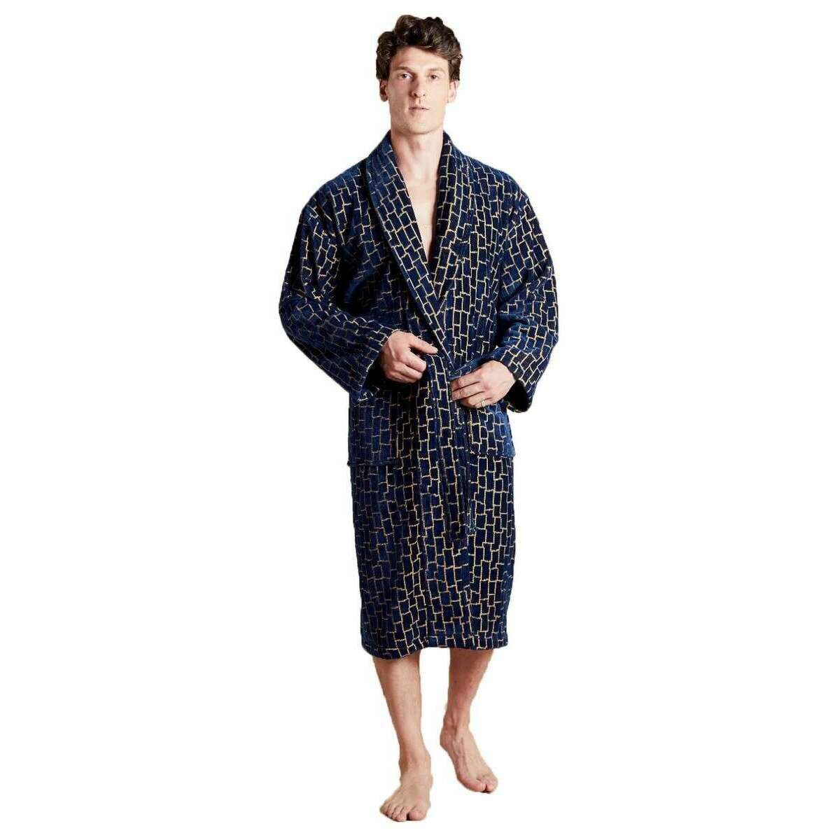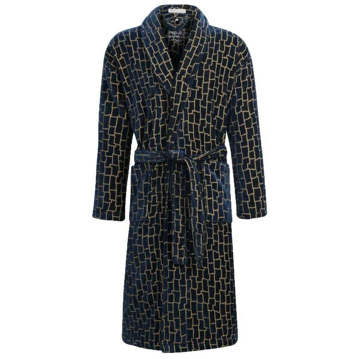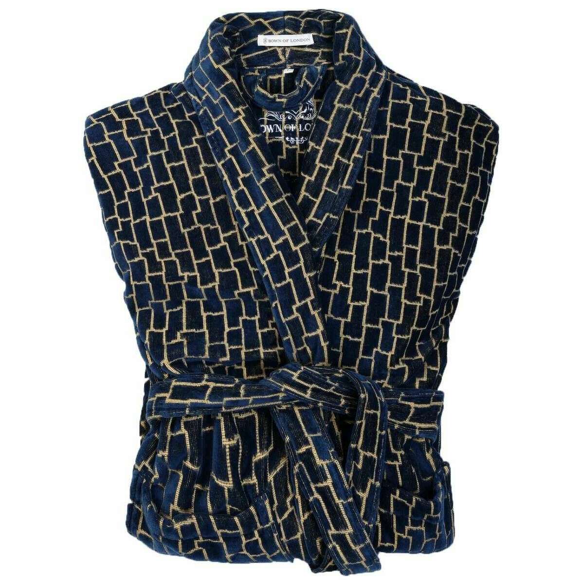 This men's agean dressing gown by the brand Bown of London is made from 100% 450gsm cotton and is showcased in blue. Also the blue/gold dressing gown is designed in a unique pattern, It is recommended to wash on a 40 degrees cotton cycle, do not use fabric conditioner and do not tumble dry to keep this dressing gown in good condition. All the dressing gowns come complete with bown of london packaging. The Bown of London Agean Dressing Gown - Blue/Gold is a luxurious piece crafted to keep you cosy and in style that is a statement piece every man needs in his loungewear collection. The super soft cotton material ensures you will stay warm and comfortable in your house whether that is doing the house chores or cuddling up by the fireplace. This dressing gown features a long belt, two front pockets and a handing loop. This is a must-have addition.