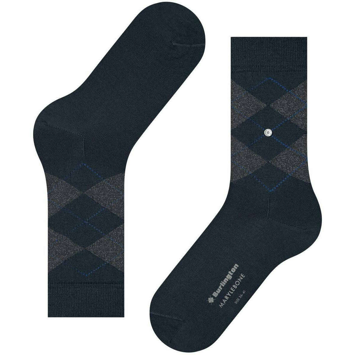 These well made women's marylebone lurex socks from Burlington come in a marine blue colour and are manufactured from 59% virgin wool, 33% polyamide, 7% rayon and 1% polyester. Also the marine blue socks are designed in a argyle pattern, It is recommended to wash at 30 degrees to keep these socks in good condition. All the socks come complete with burlington sock tags. The Burlington Marylebone Lurex Socks - Marine Blue offer a subtle Lurex yarn threading that gives you style and class. Cover your feet in this cosy virgin wool mix for a comfortable warm feel on colder days. A pair of these socks not only keep your feet warn, but at the same time, will give you a classic, professional look with the logo sole print and Burlington clip. These socks are a great option for anyone looking to add a touch of elegance to their sock collection.