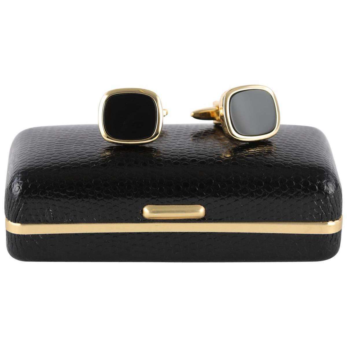 These classically designed David Van Hagen cufflinks will add a touch of style and sophistication to any shirt. The backing of each cufflink has been crafted in Gold plated metal, while the centres have each been inlayed with genuine Onyx. Packaged in a David Van Hagen Presentation box, these cufflinks would make the perfect gift.