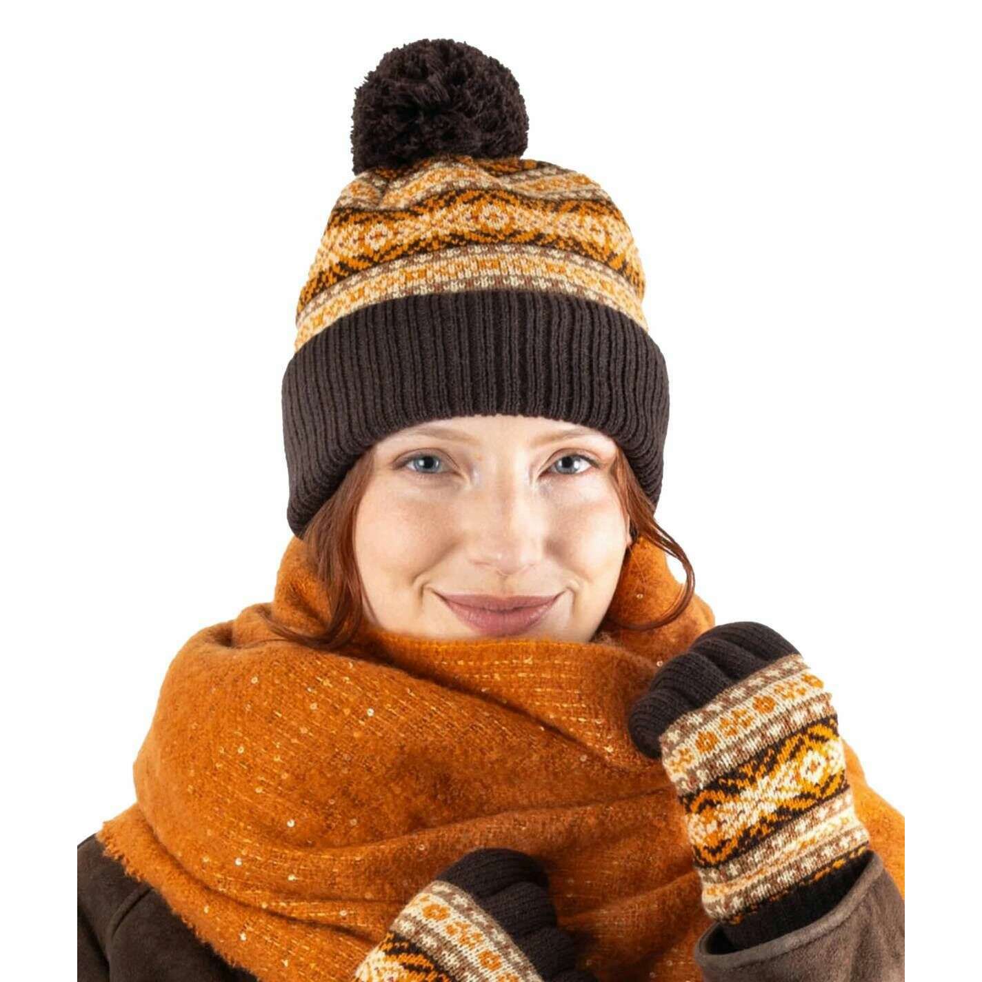 Dents Jacquard Fair Isle Knitted Bobble Hat - Chocolate Brown