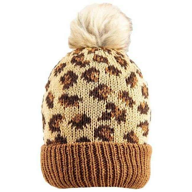 Dents Jacquard Leopard Print Pattern and Faux Fur Pom Pom Knitted Bobble Hat - Tan