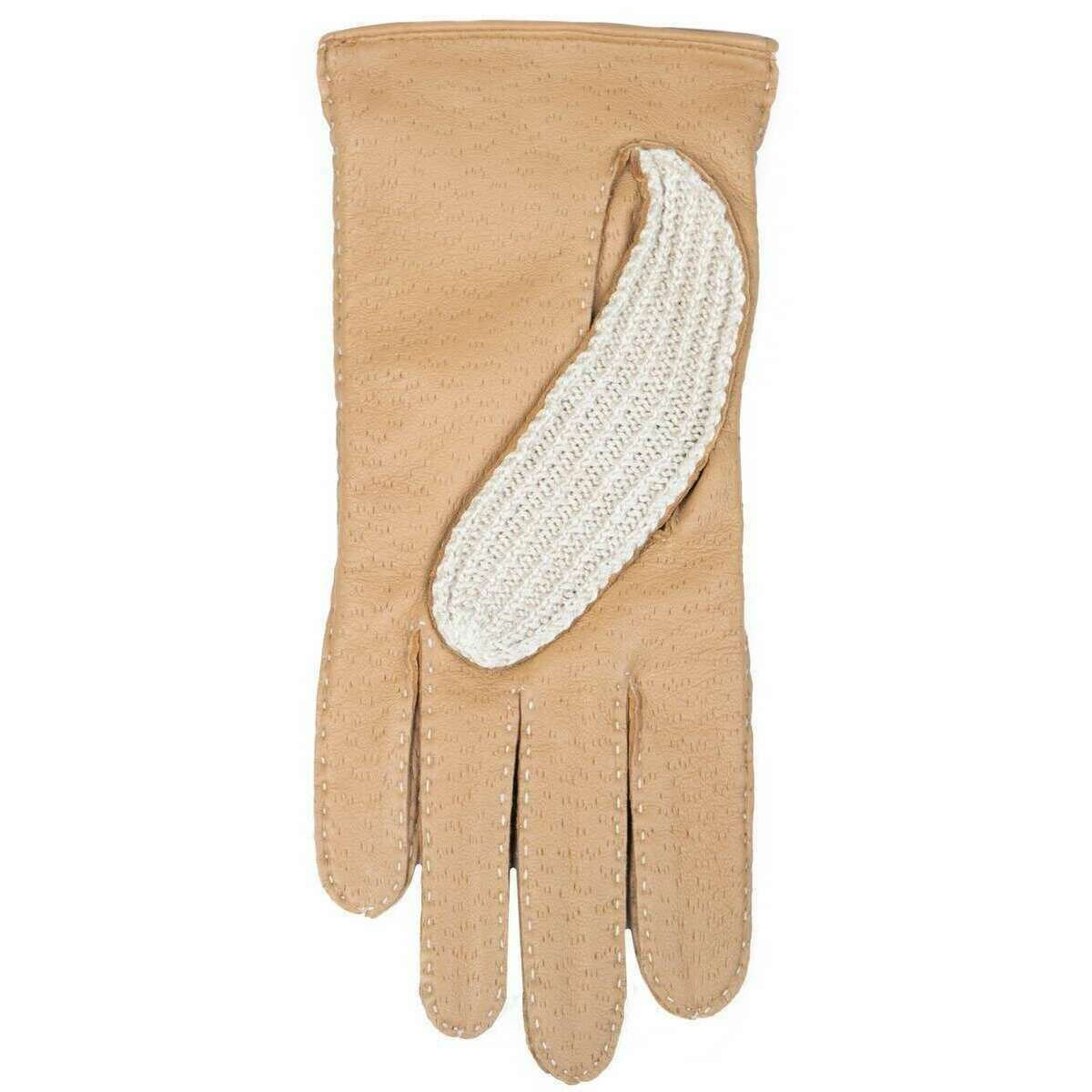 These women's kelly handsewn crochet back leather driving gloves by the brand Dents are made from 100% imitation peccary leather and are showcased in beige. Also the toffee beige gloves are designed in a plain pattern, It is recommended to hand wash with mild soap and water to keep these gloves in good condition. All the gloves come complete in dents packaging. The Dents Kelly Handsewn Crochet Back Leather Driving Gloves - Toffee Beige blend vintage charm with modern craftsmanship. The cotton crochet-knit back and thumb lend a classic, breathable texture to these timeless gloves and are ideal for those seeking a blend of traditional style and practical functionality, making them a perfect accessory for both driving and everyday wear.