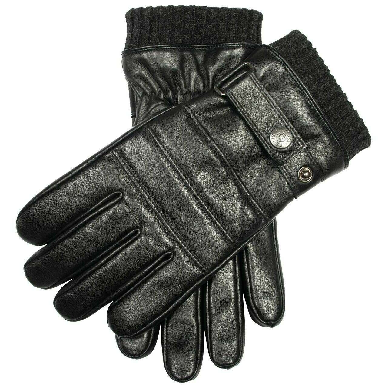 Brought to you by the brand Dents, these black men's skipton knitted cuff stitch detail leather gloves are made from outer: 100% hairsheep leather, lining: 100% polyester fleece. Also the black gloves are designed in a plain pattern, All the gloves come complete with dents tags. The Dents Skipton Knitted Cuff Stitch Detail Leather Gloves - Black have been crafted in the biker style combining a cool touch with comfort for riding or for plans during these colder seasons. Crafted with high-quality hair sheep leather ensures a water-resistant and long-lasting wear whilst having a soft faux fur lining for warmth and a snug wear. The knitted cuffs, elasticated wrist and the strap and roller fastening ensures a secure fit whilst ensuring the warmth is kept in and the cold is kept out.