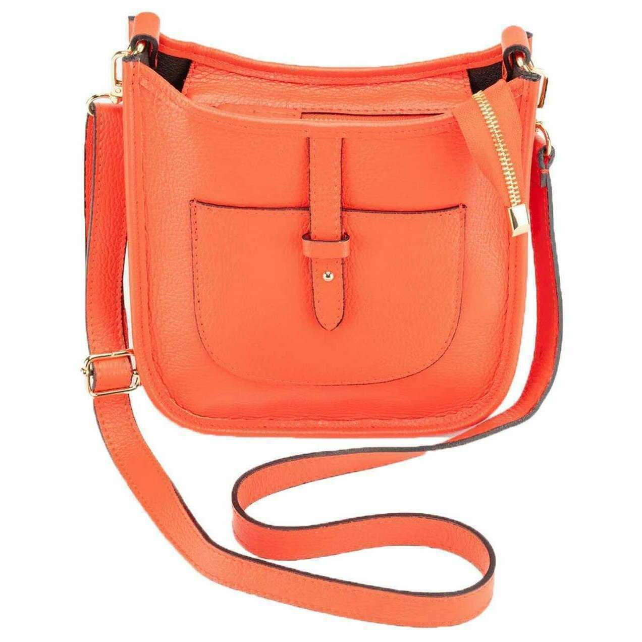 Manufactured from 100% genuine premium leather is this coral orange women's messenger bag by the designer Elie Beaumont. It measures 23cm(height) x 21.5cm(width) x 8cm(depth). All the bags come complete with elie beaumont packaging. The Elie Beaumont Messenger Bag - Coral Orange crafted from genuine premium grained thick cut leather, is an all-round perfect bag for every woman. The gorgeous design allows this bag to be a smart and sophisticated everyday bag to a night bag with only the change of an outfit. Featuring an adjustable strap for versatile styling options, an internal zipper pocket and an external pocket for organisation. The subtle gold hardware gives a small detail for a luxurious look.