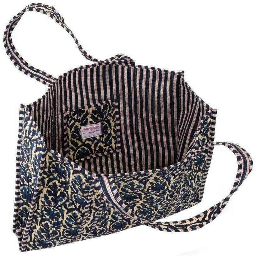 • Handmade in Jaipur India , Designed in the UK , Foldable , Lightweight , Reinforced Piping , Reversible , Internal Pocket , Matching Print Dustbag
