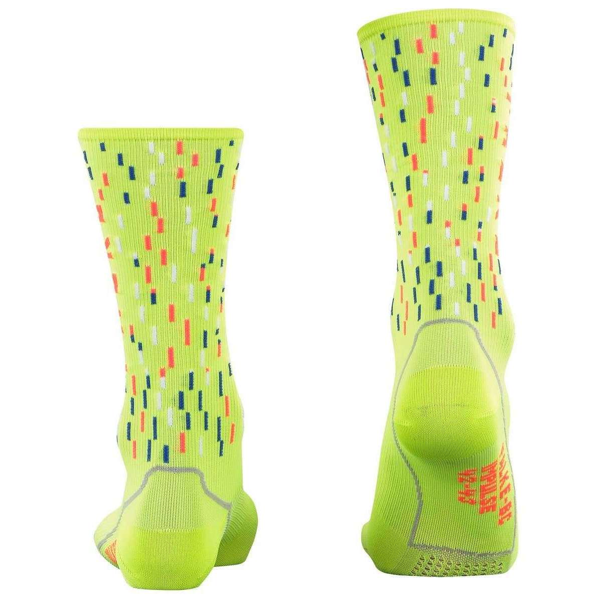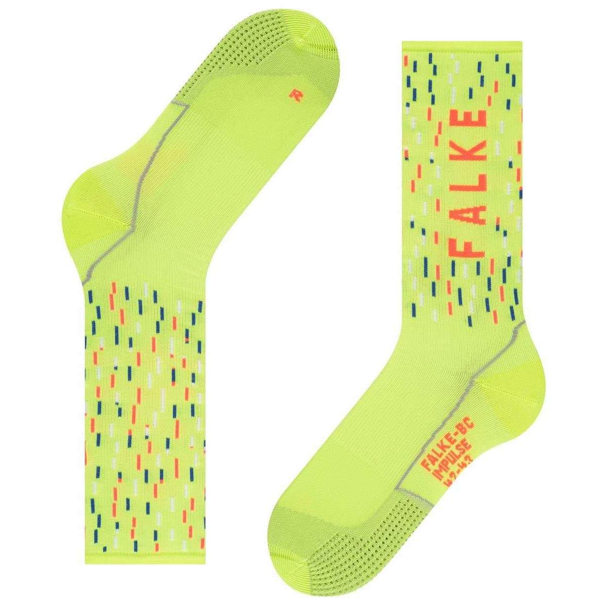 These well made unisex bc impulse peloton socks from Falke come in a lightning green colour and are manufactured from 54% polyester (49% recycled), 41% polyamide and 5% elastane. Also the lightning green socks are designed in a unique pattern, It is recommended to wash at 40 degrees to keep these socks in good condition. All the socks come complete with falke sock tags. The Falke BC Impulse Peloton Socks - Lightning Green offer an innovative mesh kit that stimulates the receptors on the ball of the feet to minimise numbness, while keeping your feet cool and dry. These cycling socks have ultralight cushioning for direct control and speed. Thanks to the impulse technology, you have improved dynamics and better balance. With eye catching coloured strokes in the shaft, these socks are complete with optimal fit with toe and sole area adapted to each foot.