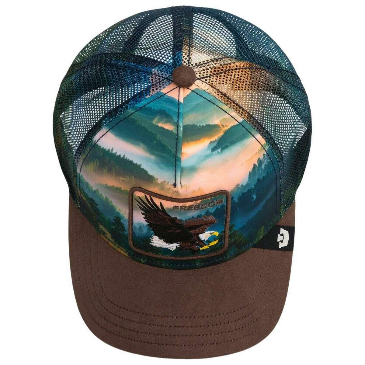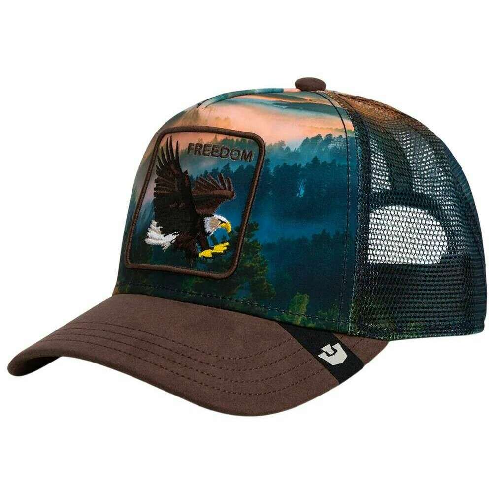 Introducing this unisex eagle in the element trucker hat by Goorin Bros, it is manufactured from 98% polyester and 2% elastane in a ground brown colour. All the hats come complete with goorin bros tags. The Goorin Bros Eagle in the Element Trucker Hat - Ground Brown captures the raw essence of nature in a single striking design. The cap showcases a majestic eagle in full flight, soaring above a dramatic landscape of forest and mountains a motif that embodies strength, freedom, and an unbreakable bond with the wilderness. The intricately embroidered patch serves as a bold focal point on the front, while the printed front panel enhances the atmospheric scenery, creating a vivid interplay of colours and natural elements. With a breathable mesh back, the cap ensures optimal comfort, and the adjustable snapback closure guarantees a custom fit for any adventure. Crafted with premium attention to detail and featuring a vibrant natural design, this cap is perfect for anyone who wants to bring powerful outdoor energy into their everyday look whether for urban life or true outdoor exploration. A standout piece for those who carry the spirit of the wild.