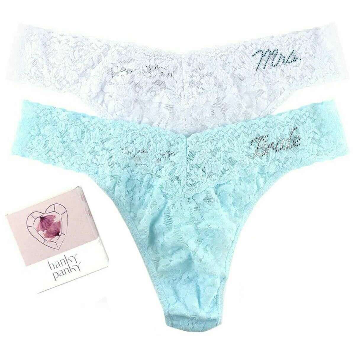 This women's bride and mrs 2-pack original rise thong has been made from 100% nylon body, 90% nylon, 10% spandex trim and 100% supima cotton crotch lining, featured in a blue colour and is from the brand Hanky Panky. Hanky Panky have made this bride and mrs 2-pack original rise thong in USA. It is recommended to hand wash in cool water with mild detergent and dry flat to keep this underwear in good condition. 2 pack underwear is value for money ensuring they are a good buy, All the underwear comes complete with hanky panky packaging. The Hanky Panky Bride and Mrs 2-Pack Original Rise Thong - Celeste Blue/White are certain to impress with their super comfortable fit and feminine design. These thongs have been flawlessly crafted with a design that sits higher on the hips and will give you no visible panty line when wearing for any occasion. Their V-front and V-back waistband will keep these looking stylish on you all year round. Make these the most ideal new underwear you can buy.