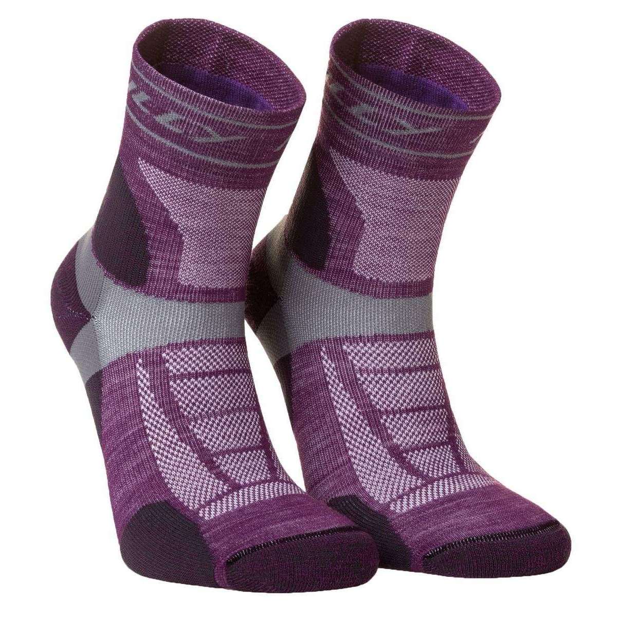 Perfect for men or women are these Hilly blackberry/grey trail anklet med socks, they are also made from 64% polyamide, 33% merino wool and 3% elastane. Also the blackberry/grey socks are designed in a block pattern, All the socks come complete with hilly packaging. The Hilly Trail Anklet Med Socks - Blackberry/Grey are perfect for off-road running from autumn through to spring as the Merino wool content will help to regulate your foot temperature. It is also high wicking and anti-microbial allowing your feet to stay fresh during your run. The LYCRA® DRY TECHNOLOGY will provide you with a fit that is quick-drying and the medium-level of terry loop cushioning in key pressure zones offers you the utmost durability. The flat toe seam construction and reinforced toe box helps to avoid holes whilst descending. They are the perfect running partner.
