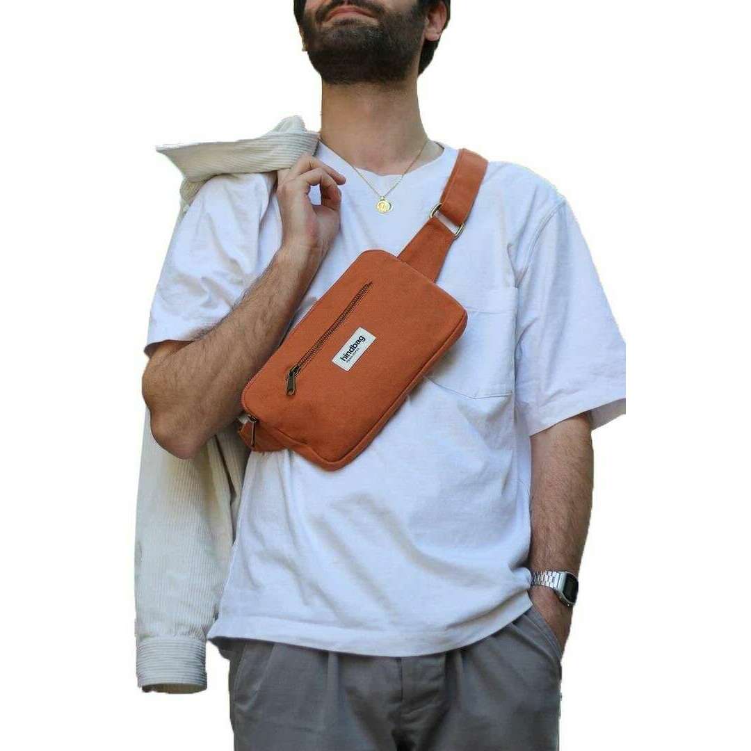 This unisex harry rectangular bum bag by the brand Hindbag is made from 100% organic cotton and is showcased in orange. It measures 14cm(height) x 24cm(width) x 2cm(depth). All the bags come complete with hindbag tags. The Hindbag Harry Rectangular Bum Bag - Sienna Orange offers an adjustable shoulder strap to allow for it to be worn with light summer attire or thick winter coats. Crafted from thick, resistant organic cotton which is labelled GOTS meaning the production and transformation processes respect the environment and respect and improve working conditions. The rectangular silhouette offers sleek style to suit everyone, and its design allows for everyday essentials to be carried within plus offering additional zipped compartments at the front and back. This is an ideal choice if you want to be able to carry your essentials effortlessly while levelling up your attire.