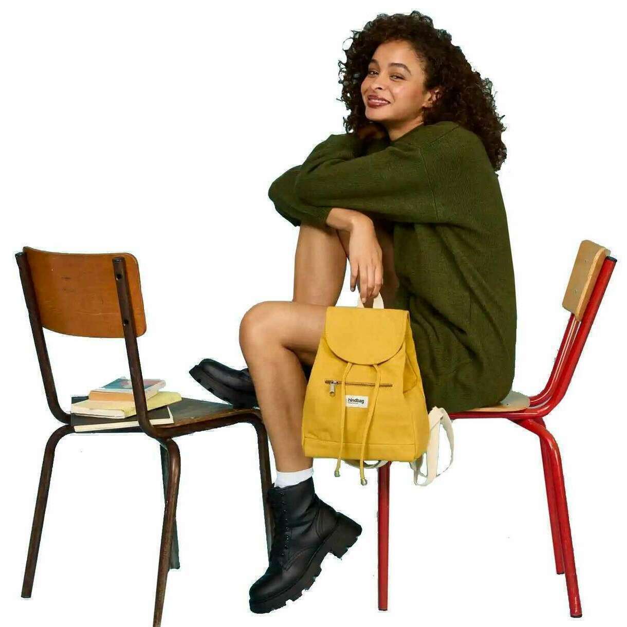 This unisex mini eliot small backpack by the brand Hindbag is made from 100% organic cotton and is showcased in yellow. It measures 31cm(height) x 24cm(width) x 13cm(depth). All the bags come complete with hindbag packaging. The Hindbag Mini Eliot Small Backpack - Saffron Yellow is suitable for young and old alike! Featuring two exterior pockets and one interior pocket, you can slip in what you need while keeping your hands free. The timeless design of this mini backpack blend vintage charm with modern functionality, making them a popular choice for daily use.